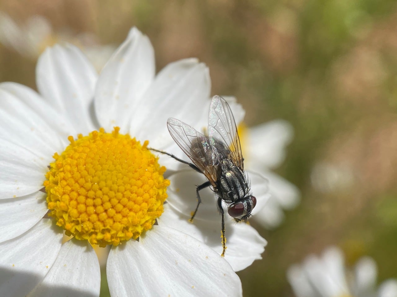 A Flesh Fly (family Sarcophagidae) leaves an English Daisy flowerhead after taking nectar from the flowers. Note the pollen on its legs.