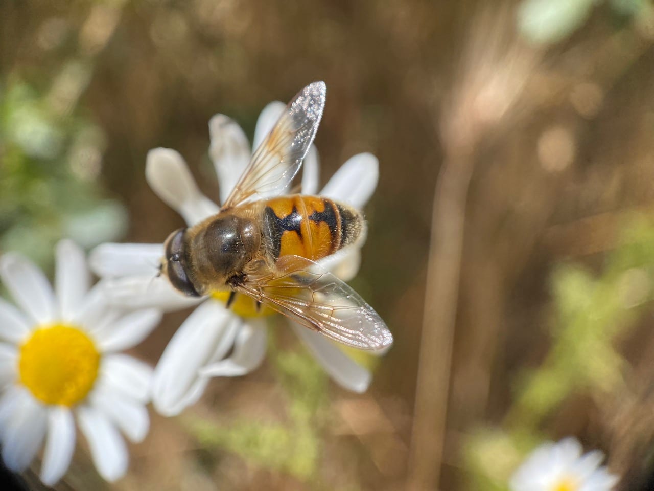 A Common Drone Fly, Eristalis tenax (family Syrphidae) is foraging on English Daisy flowers. This hover fly is commonly mistaken for a Honey Bee, Apis mellifera (family Apidae).