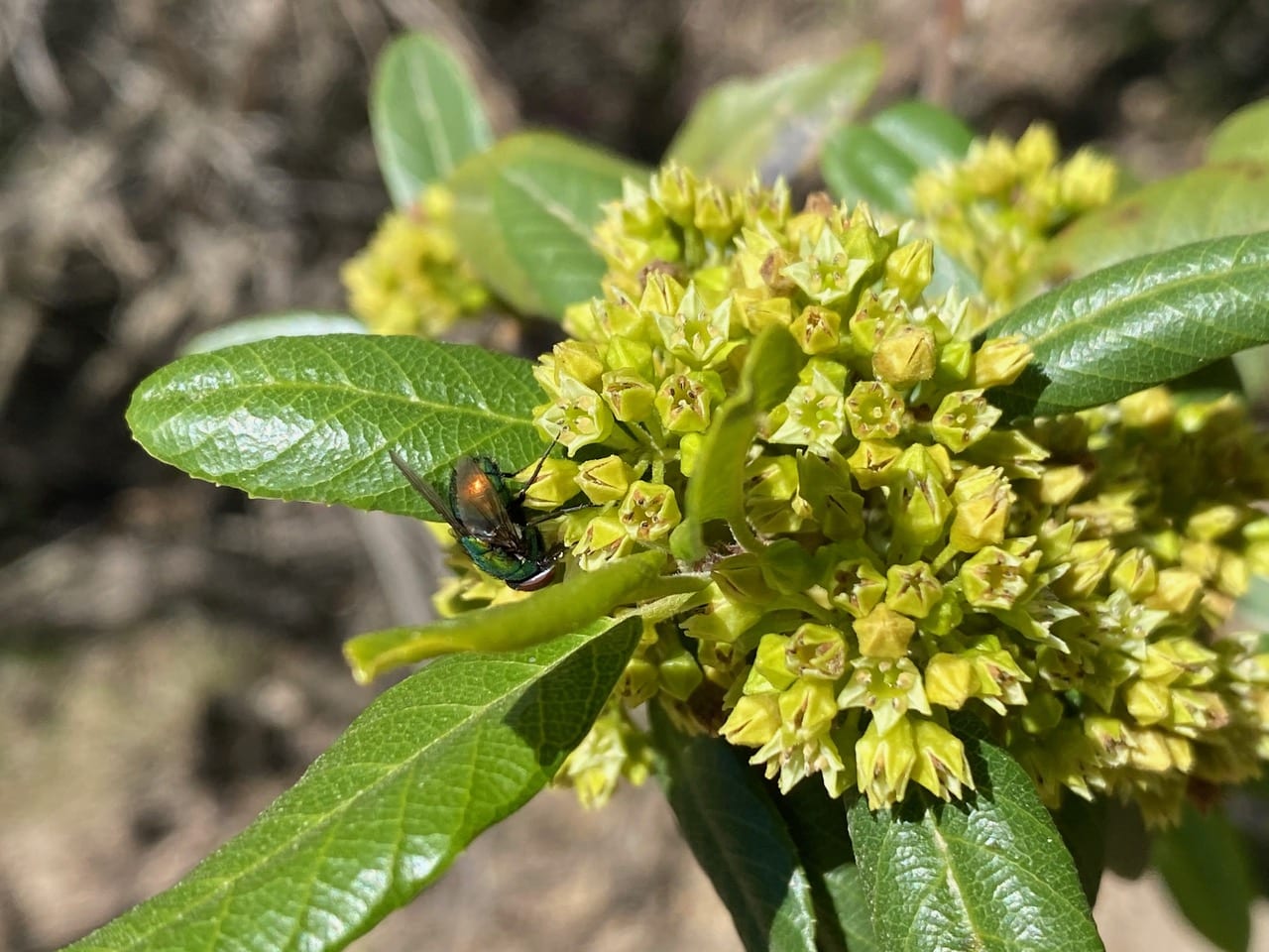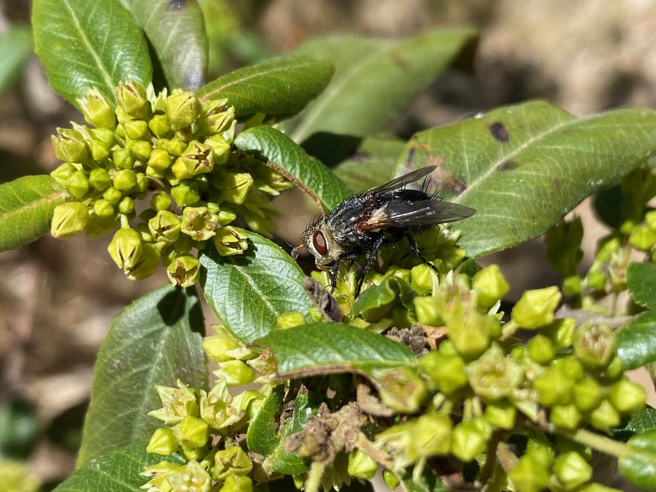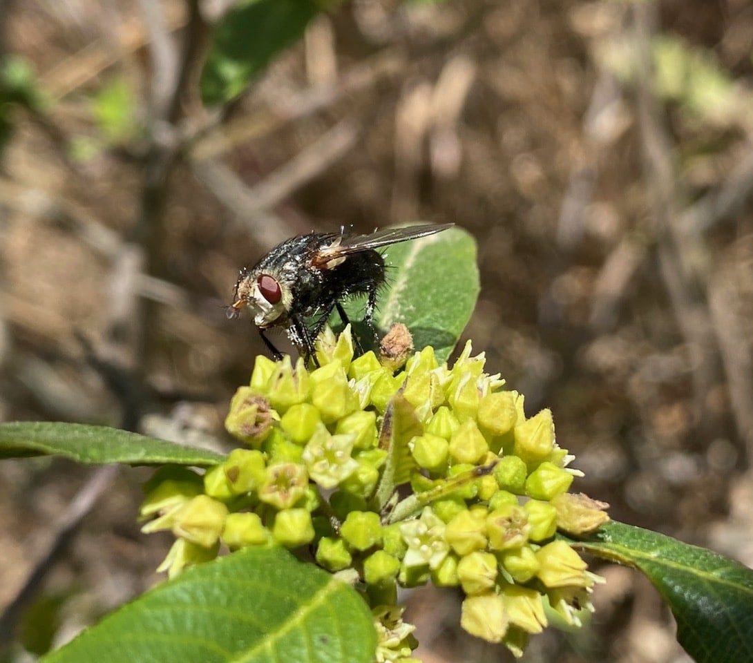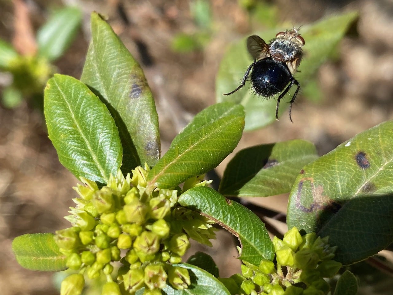 A Blow Fly (family Calliphoridae) is foraging on an inflorescence of California Coffeeberry.