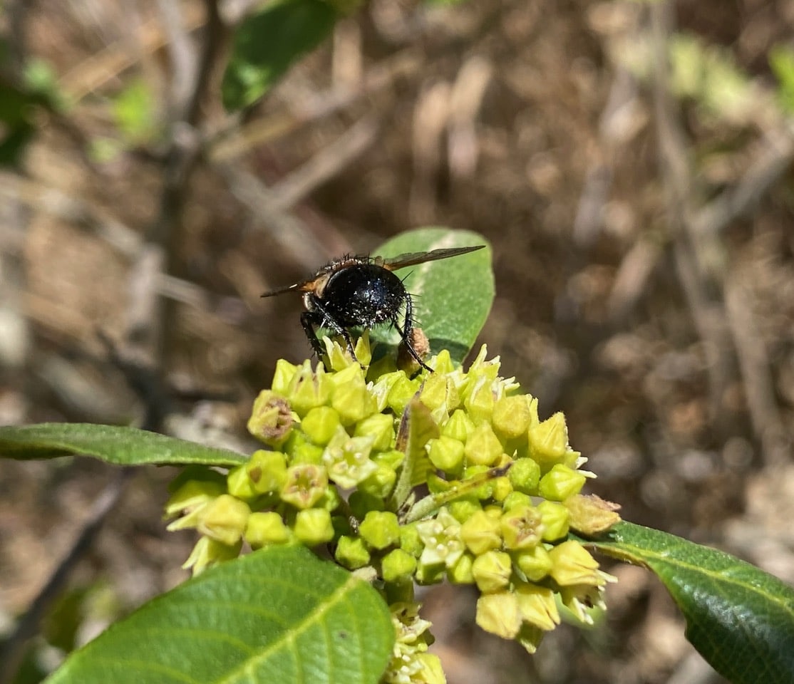 Ooh, a stocky, bristly fly has landed on the flowers of Coffeeberry. A Bristle Fly (family Tachinidae)?