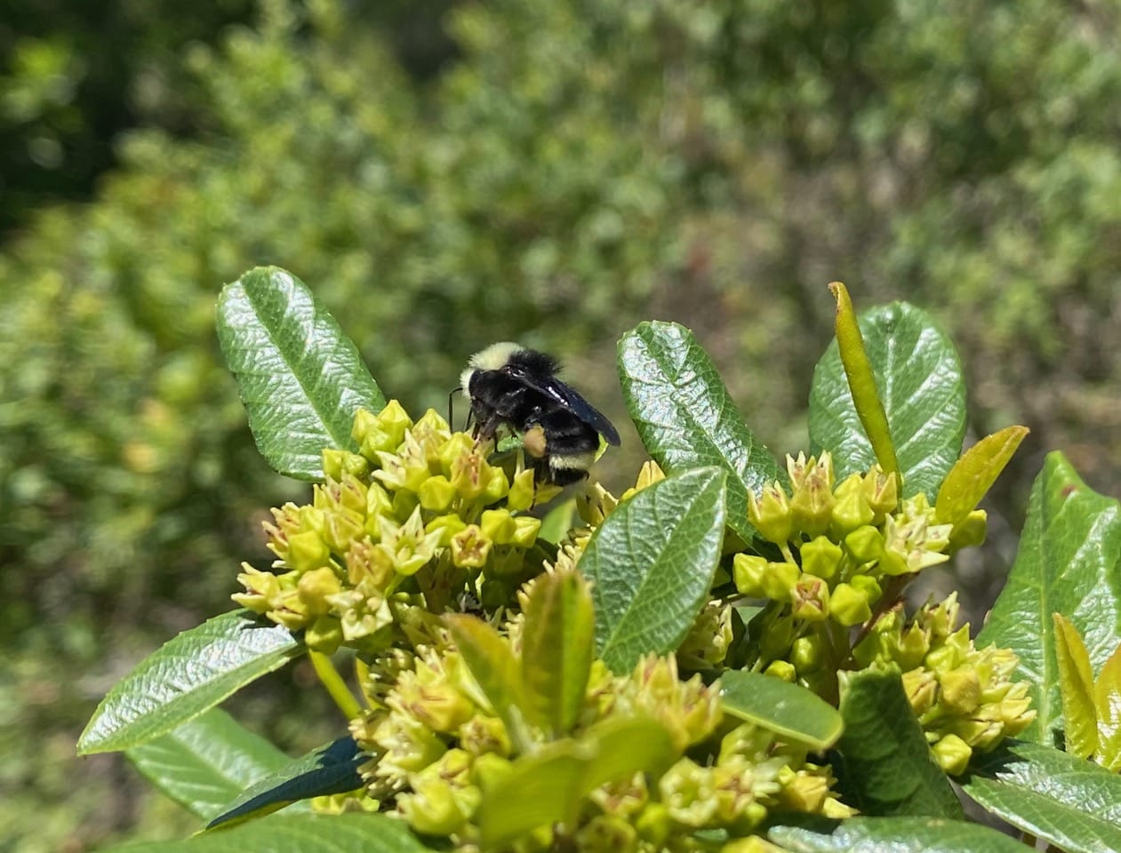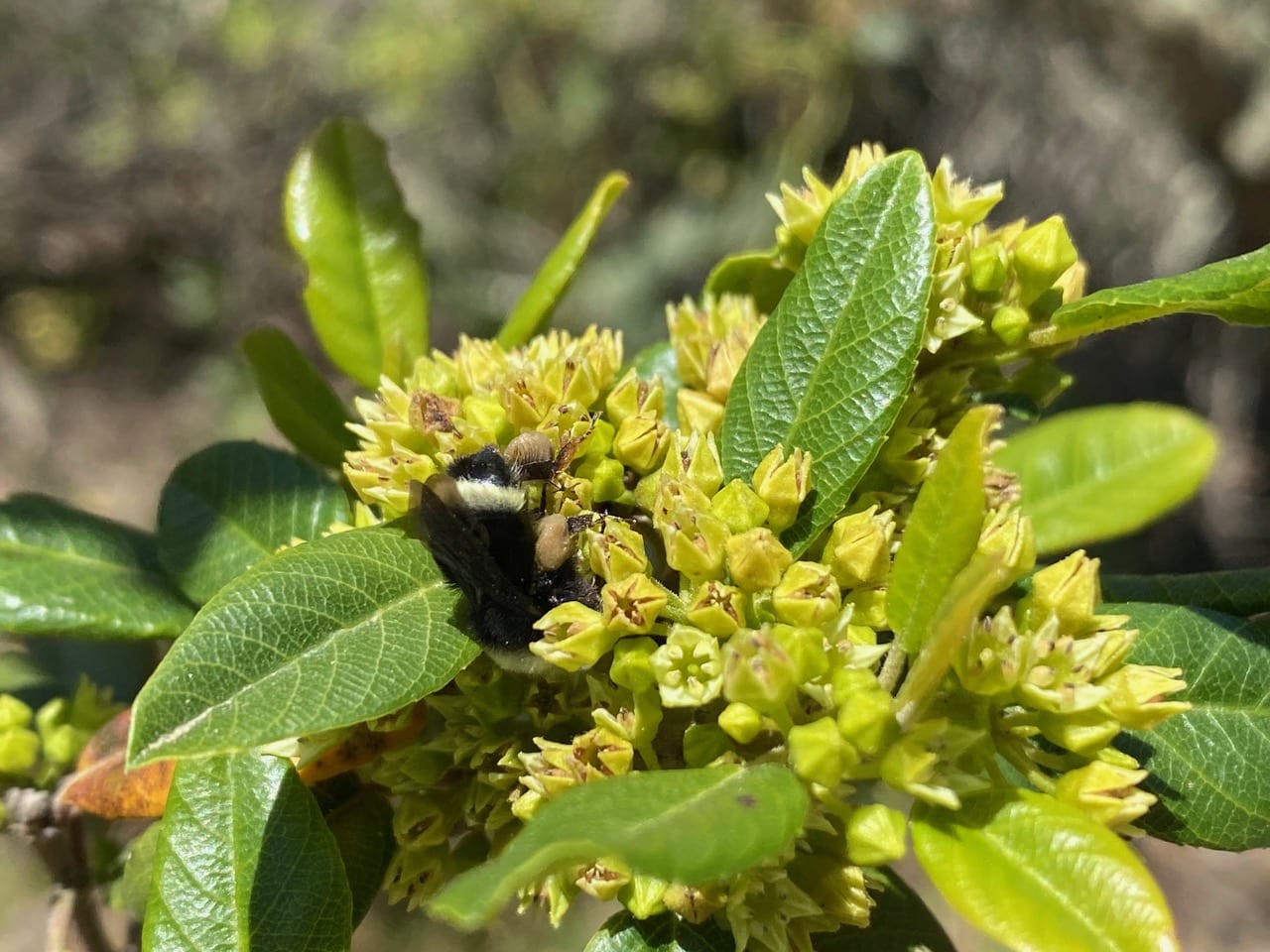 A Yellow-faced Bumble Bee, Bombus vosnesenskii (family Apidae) is foraging on the flowers of Coffeeberry, Frangula californica. I wonder if the pollen in her pollen baskets is from the plant?
