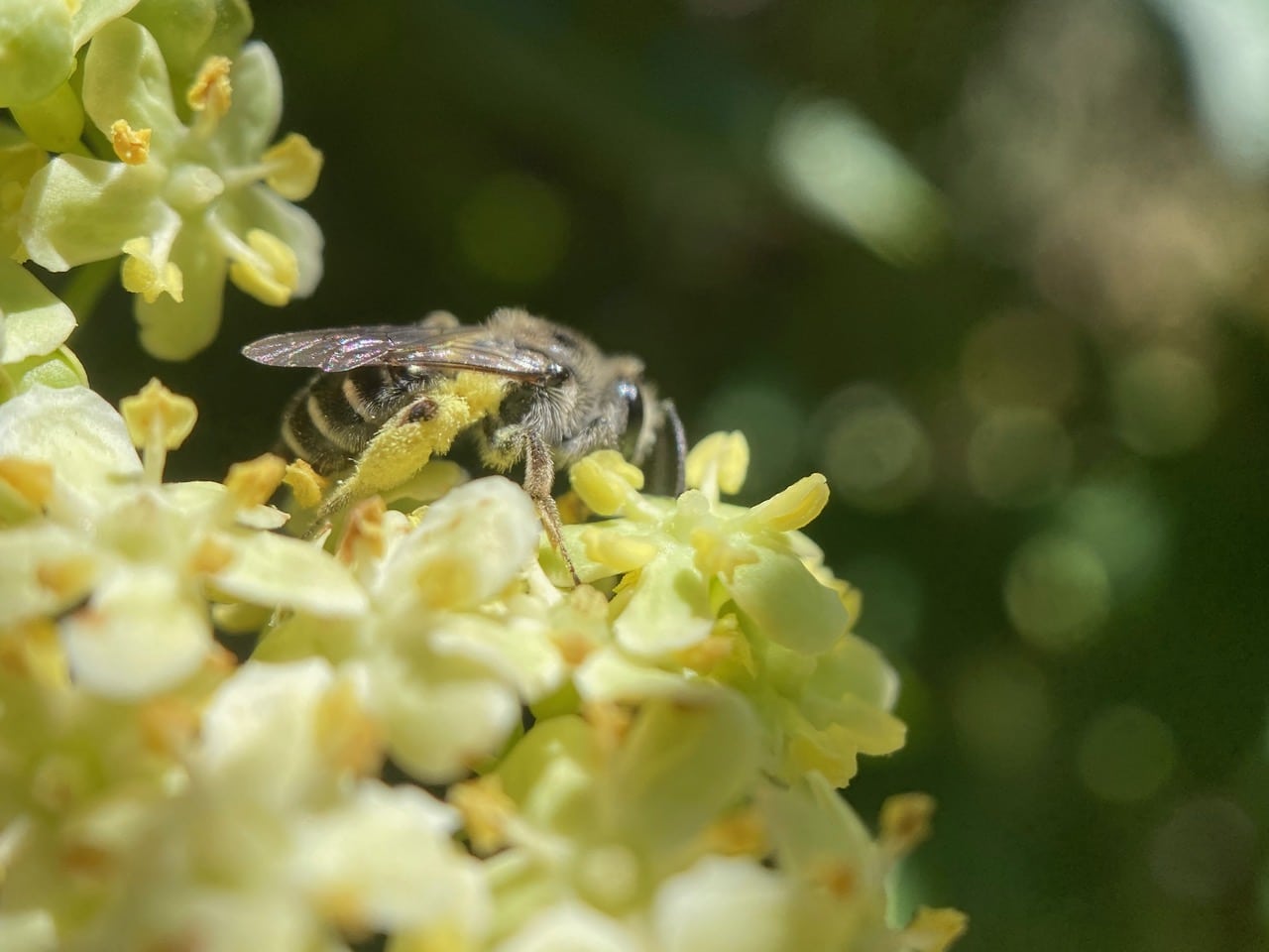 The bee is either a Sweat Bee, Halictus sp. (family Halictidae), or a Mining Bee (family Andrenidae). Her foraging activity on the Elderberry flowers is highly suggestive that the plant is pollinated by small bees, among other possibilities.