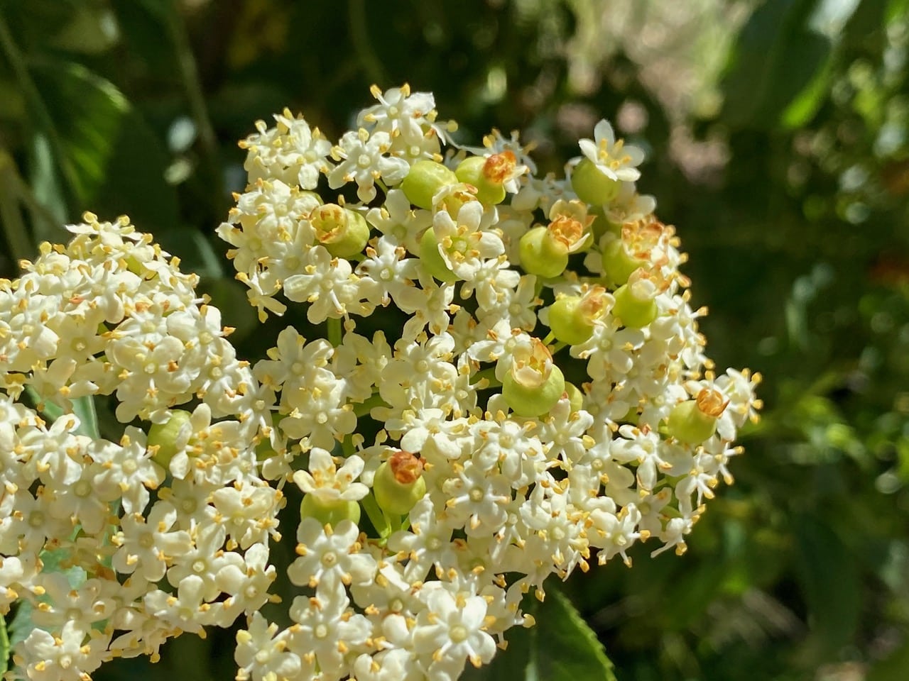 The small, cream-colored flowers of Blue Elderberry, Sambucus mexicana are beginning to develop into fruits,