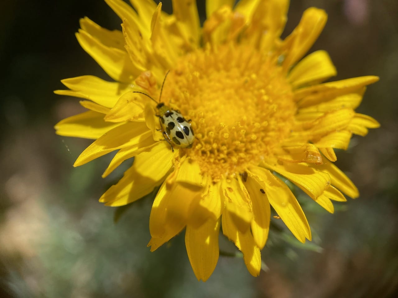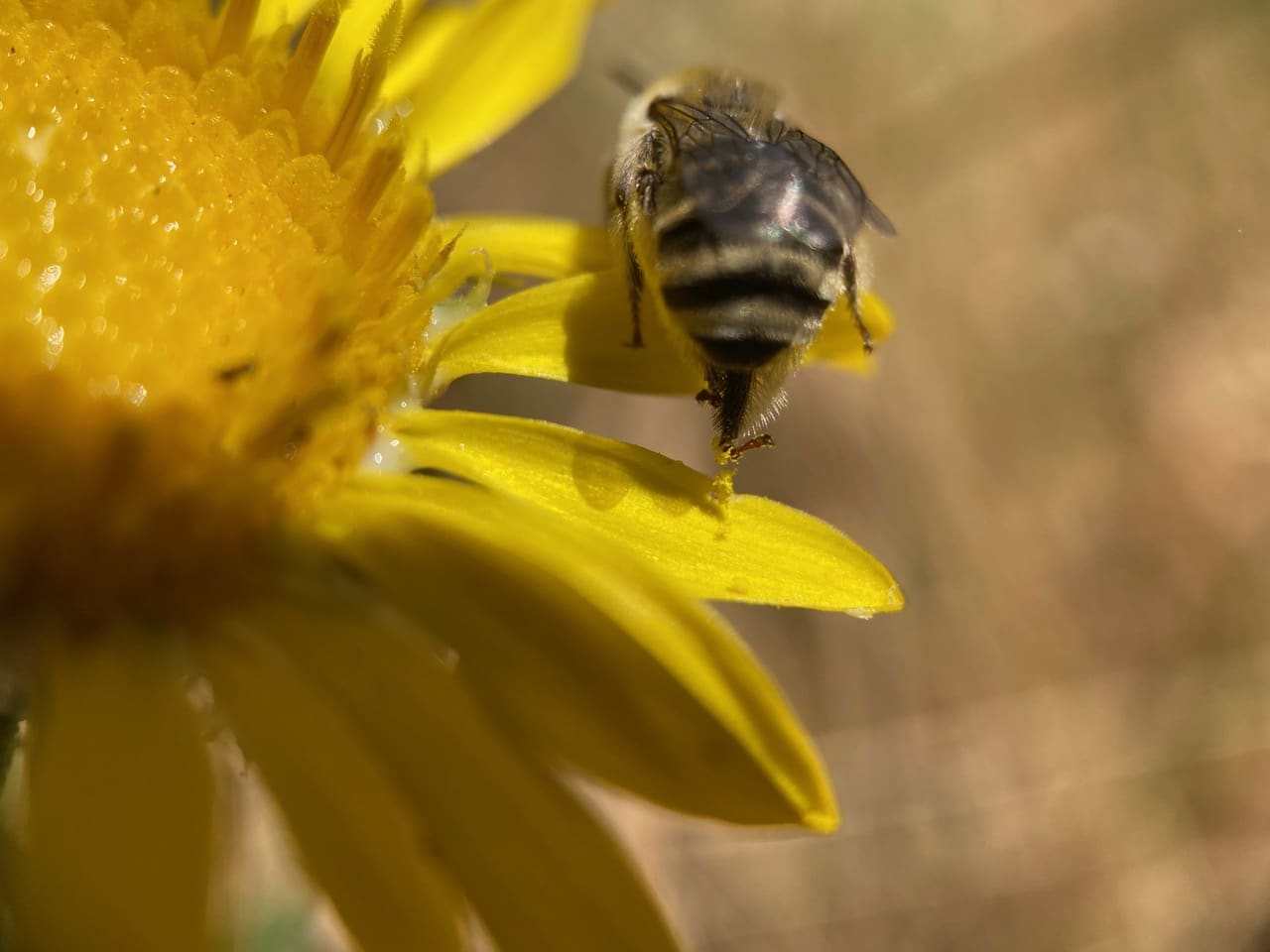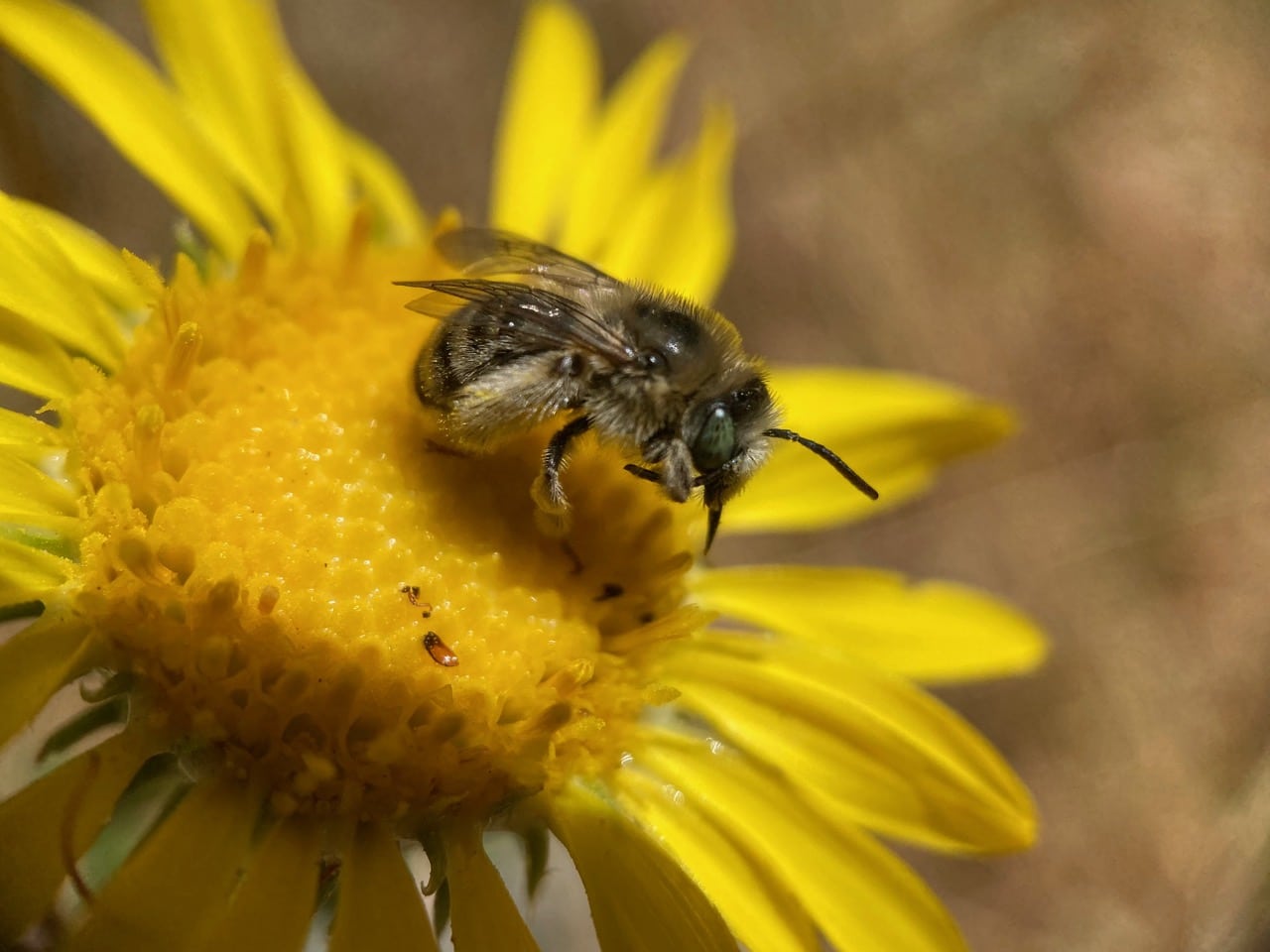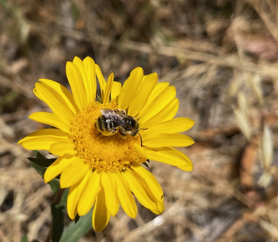 A similar bee has landed on another Grindelia flowerhead. Her scopae are empty.