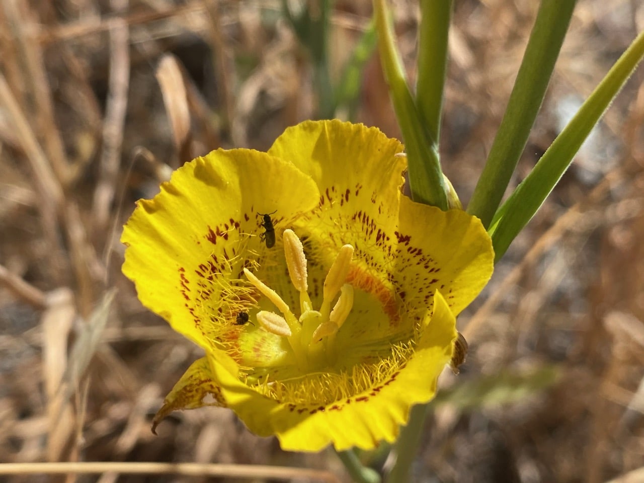 The Yellow Mariposa Lily, Calochortus luteus is blooming predictably in the little grassy triangle at the end of Sunburn Drive. The large, bright yellow flowers are not attracting any big insects today. Some Soft-winged Flower Beetles, Listrus sp. (family Melyridae, subfamily Dasytinae) can be seen feeding in the flowers. The orange, crescent-shaped patches near the base of the petals are the nectar glands.