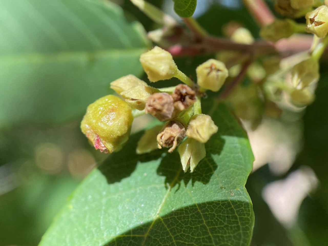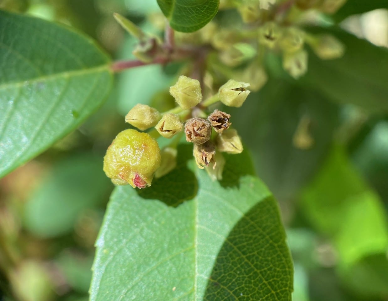 What’s this strange structure that looks like a bumpy, deformed fruit growing among a cluster of young and aborted flowers. It has an opening at the tip, showing some pink parts. My best guess is that it is a flower gall. Did an insect induce the development of the gall?
