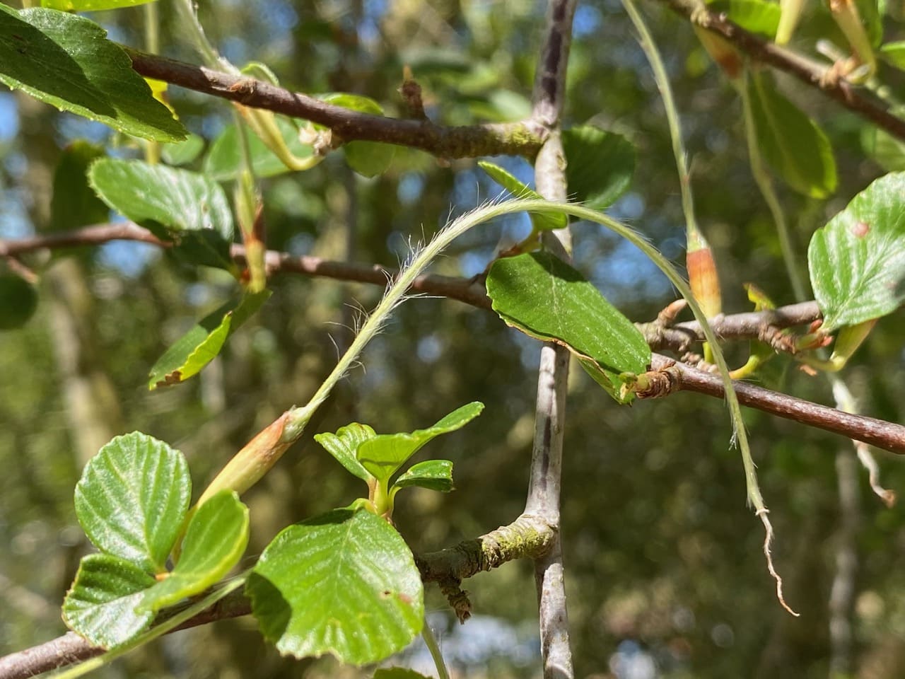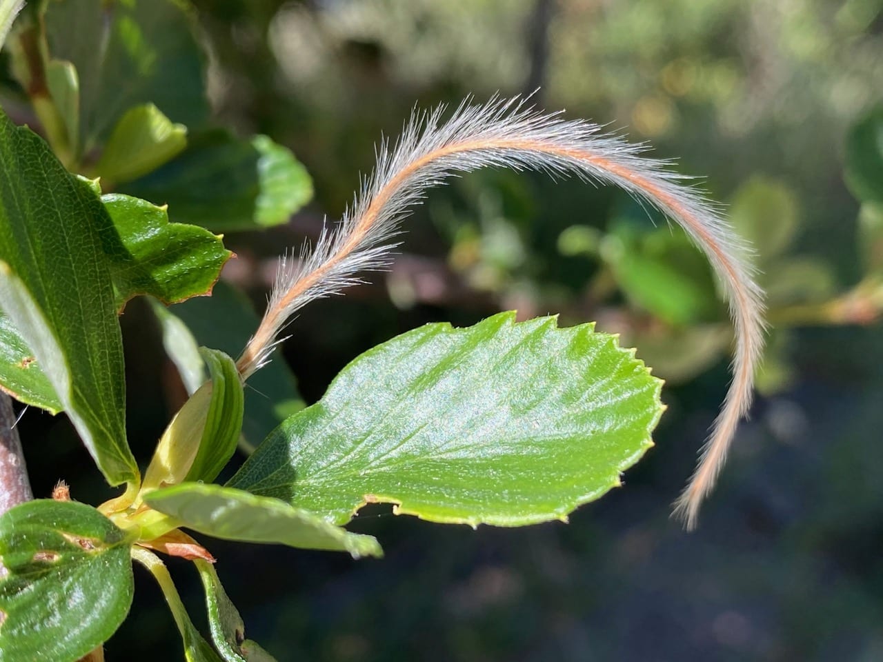 The Mountain Mahogany, Cercocarpus betuloides (family Rosaceae) by the fence of the FOSC Native Plant Nursery has given me much pleasure over the years. Backlit by the sun, the evergreen tree appears silvery in late summer through fall, due to the feathery fruits. The tree is undergoing the magical transformation now, with the fruits ripening and the attached plumes lengthening and opening. The plume is actually a persistent style that does not wither away when the flower senesces, but instead keeps growing to form the feathery plume.