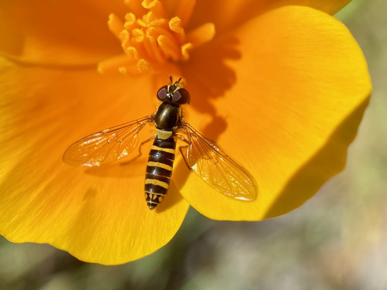 A Diamond Spottail, Fazia micrura (family Syrphidae) lands on a California Poppy, Eschscholzia californica. The species is easily identified by the four diamond-shaped yellow markings near the tip of the abdomen.