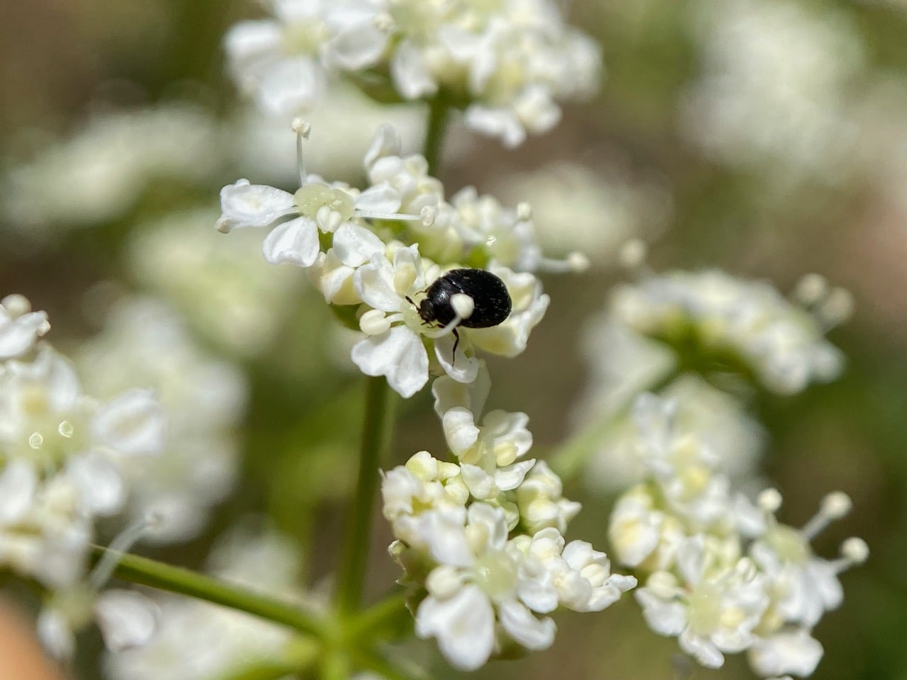 A tiny Skin Beetle, Cryptorhopalum sp. (family Dermestidae) is foraging on a cluster of Poison Hemlock flowers.