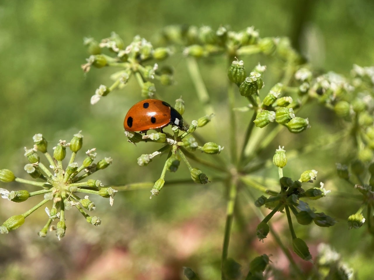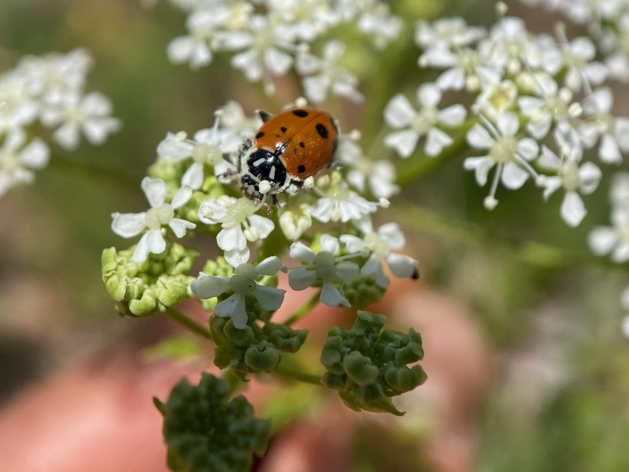 A Seven-spotted Lady Beetle, Coccinella septempunctata (family Coccinelidae) is resting on an umbel of developing fruits of Poison Hemlock.