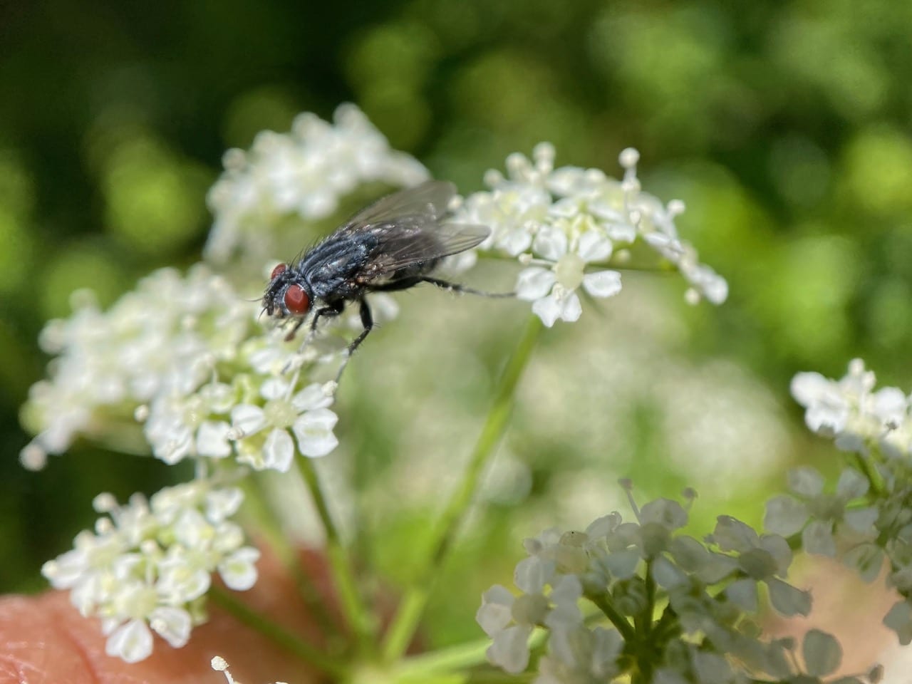 A bluish fly with striped thorax is running around on the Poison Hemlock flowers. I can’t get a reliable identification from iNaturalist. This seems to be the case with Dipterans. They are a very diverse group and difficult to identify simply from photos.