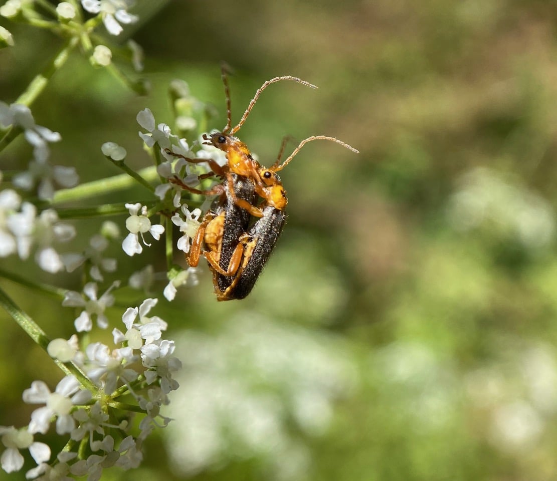 Buffeted by the wind, a pair of mating Soldier Beetles hang on tight to the cluster of Poison Hemlock, their long antennae waving wildly.