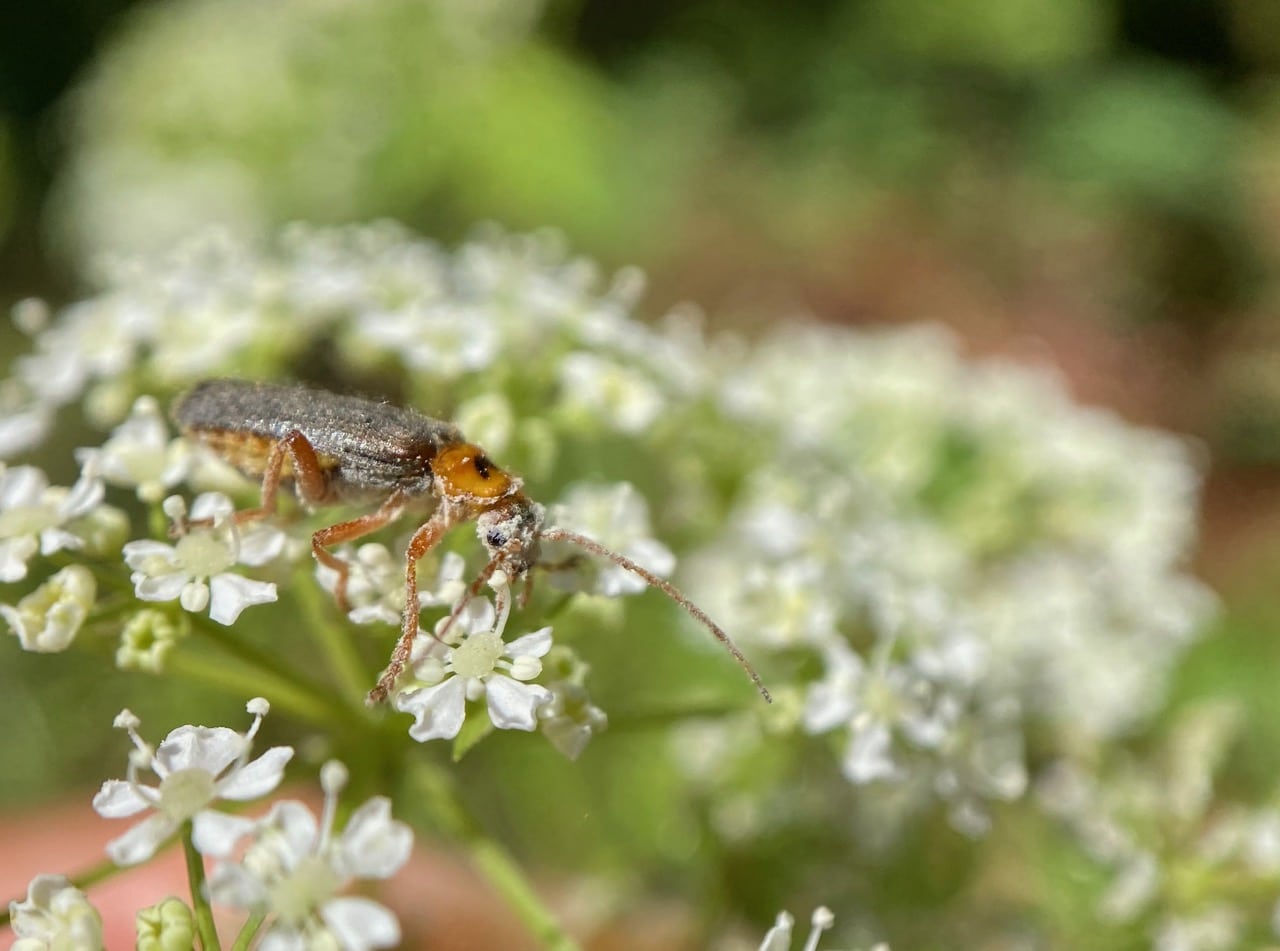 Wow, I wonder if this Soldier Beetle is ever going to be able to clean all that sticky cream-colored pollen off its face, eyes, and antennae.