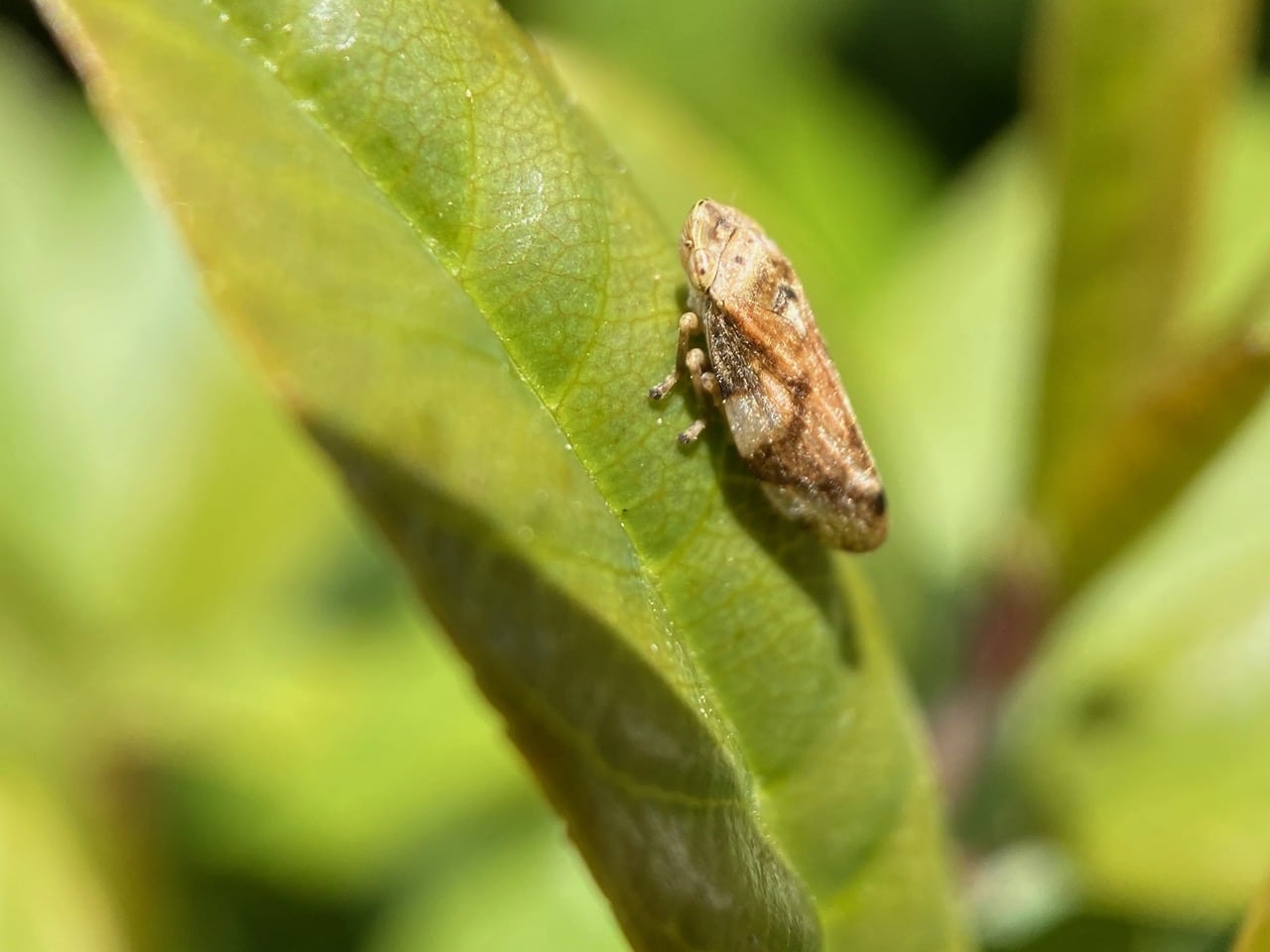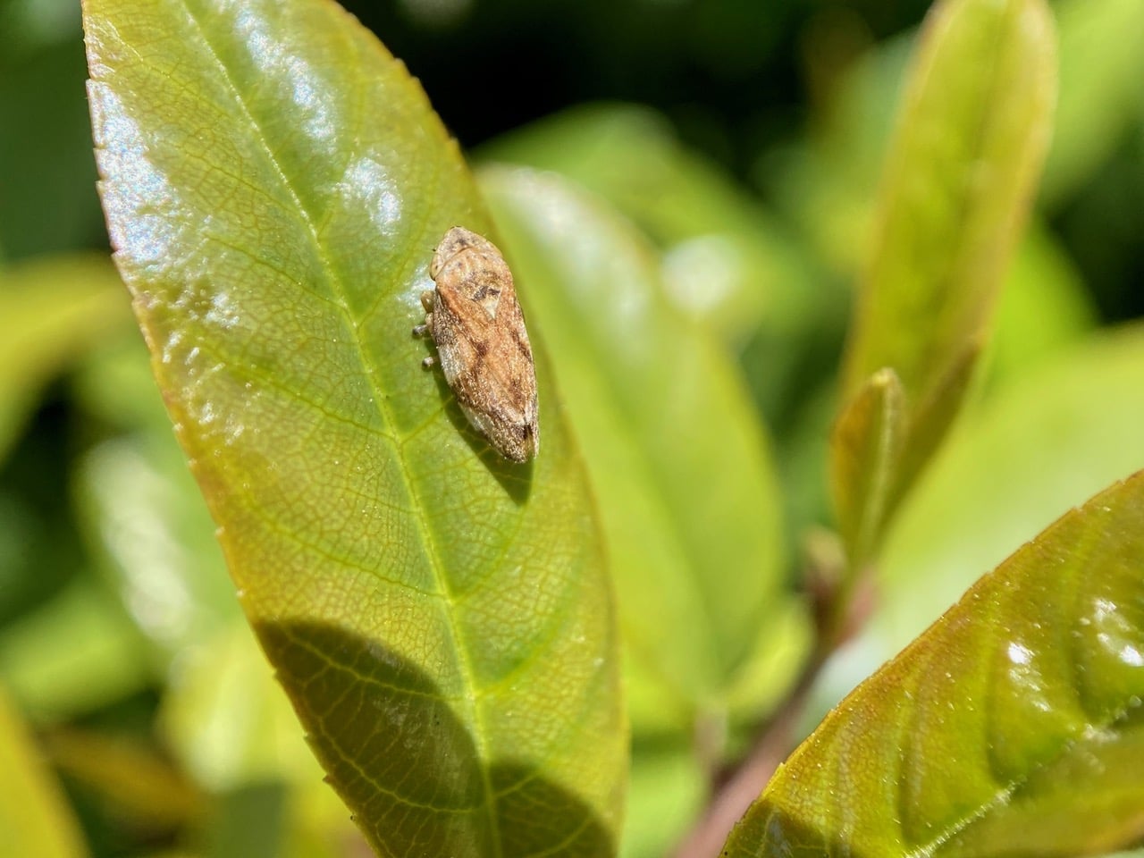 Calm as a yogi in meditation, a Meadow Spittlebug or Meadow Frog Hopper, Philaenus spumarius (family Aphrophoridae) is resting on a young leaf of Coffeeberry, Frangula californica.