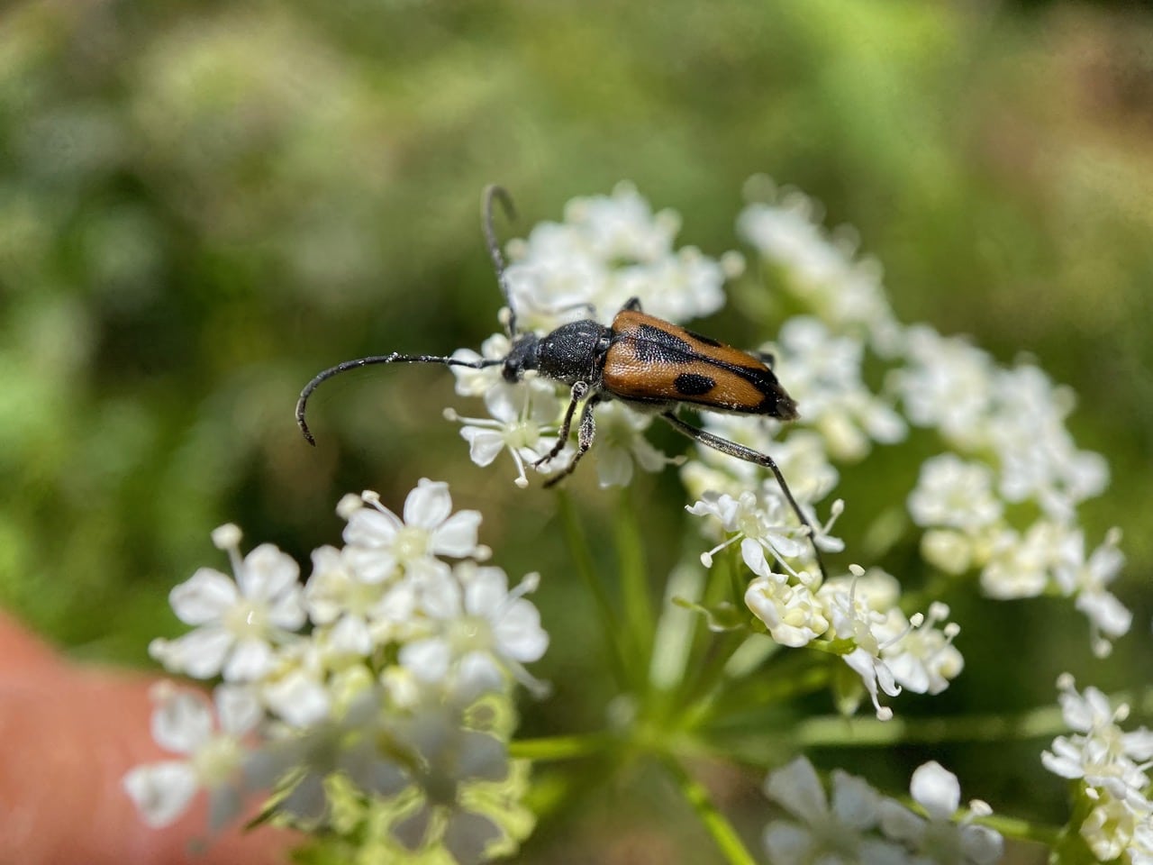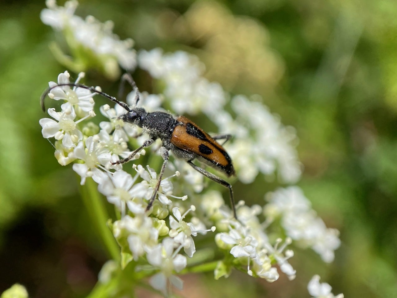 Ooh, there’s a male Dimorphic Flower Longhorn Beetle, Anastrangalia laetifica (family Cerambycidae, subfamily Lepturinae) on that umbel of Poison Hemlock flowers.
