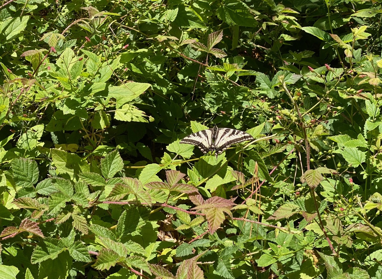 A large butterfly flutters by, landing on a Blackberry thicket. It is a Pale Swallowtail, Papilio eurymedon (family Papilionidae).
