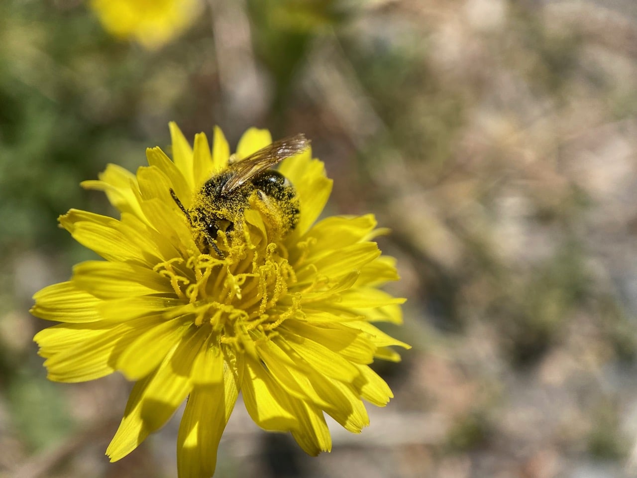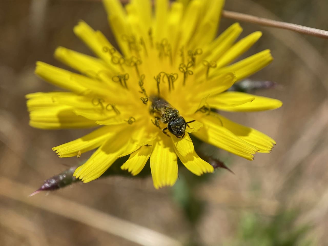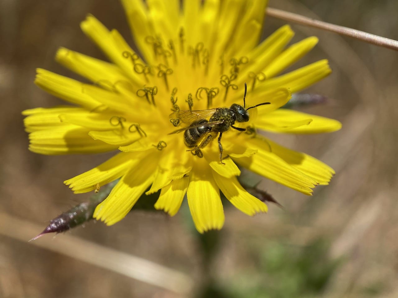 A little bee peers from a Catsear flowerhead. That looks like the face of a Sweat Bee (family Halictidae).