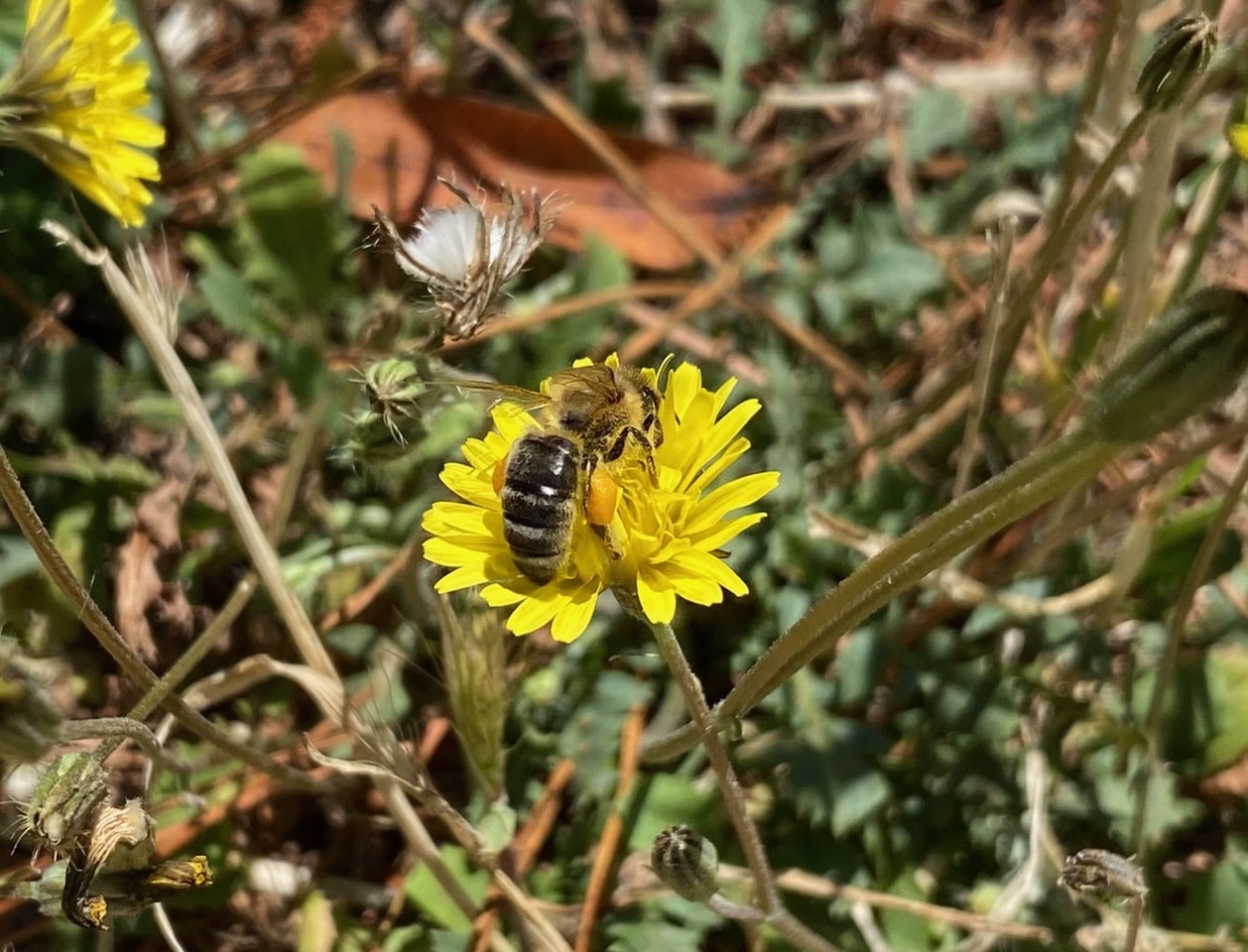A small bee is rummaging through a Catsear flowerhead, its body covered with pollen. The white stripes on its abdomen tells me that it is probably a Tripartite Sweat Bee, Halictus tripartitus (family Halictidae).