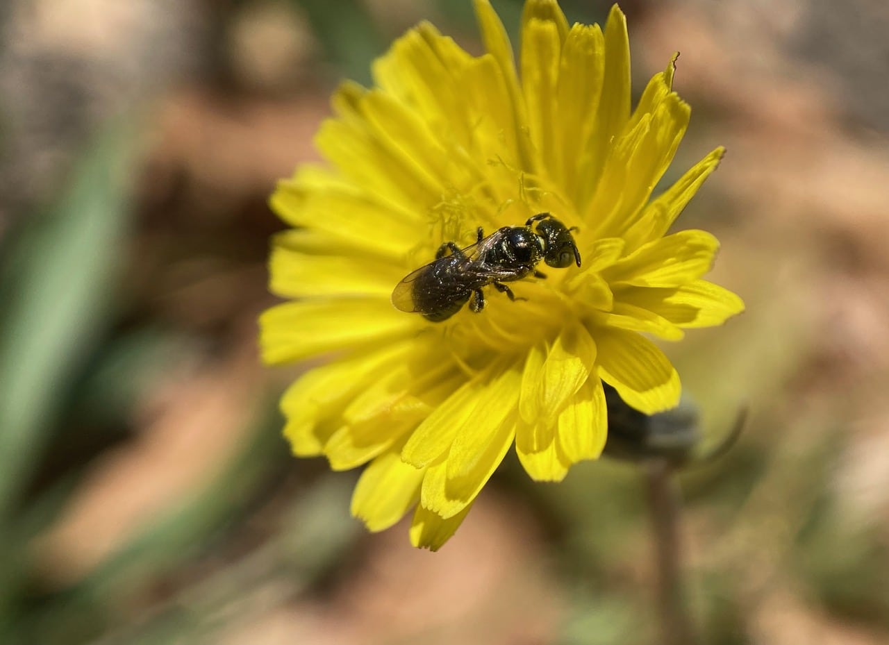 A little glossy black bee is foraging on a freshly opened Catsear flowerhead. It has all the appearance of a Small Carpenter Bee, Ceratina sp. (family Apidae).