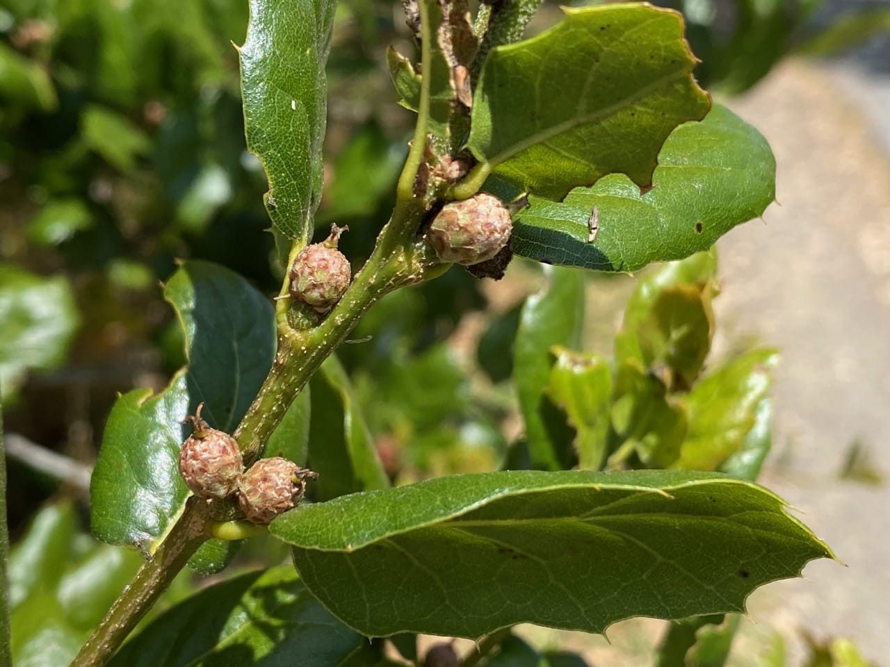 I check the low-hanging branches of this Coast Live Oak every time I walk this trail. I have been tracking the development of the acorns ever since they were mere tiny female flowers at the leaf axils.