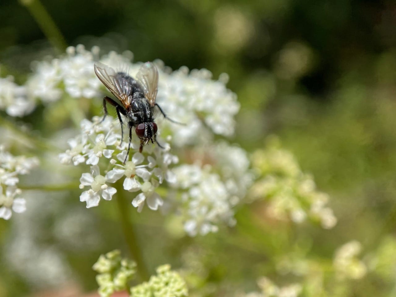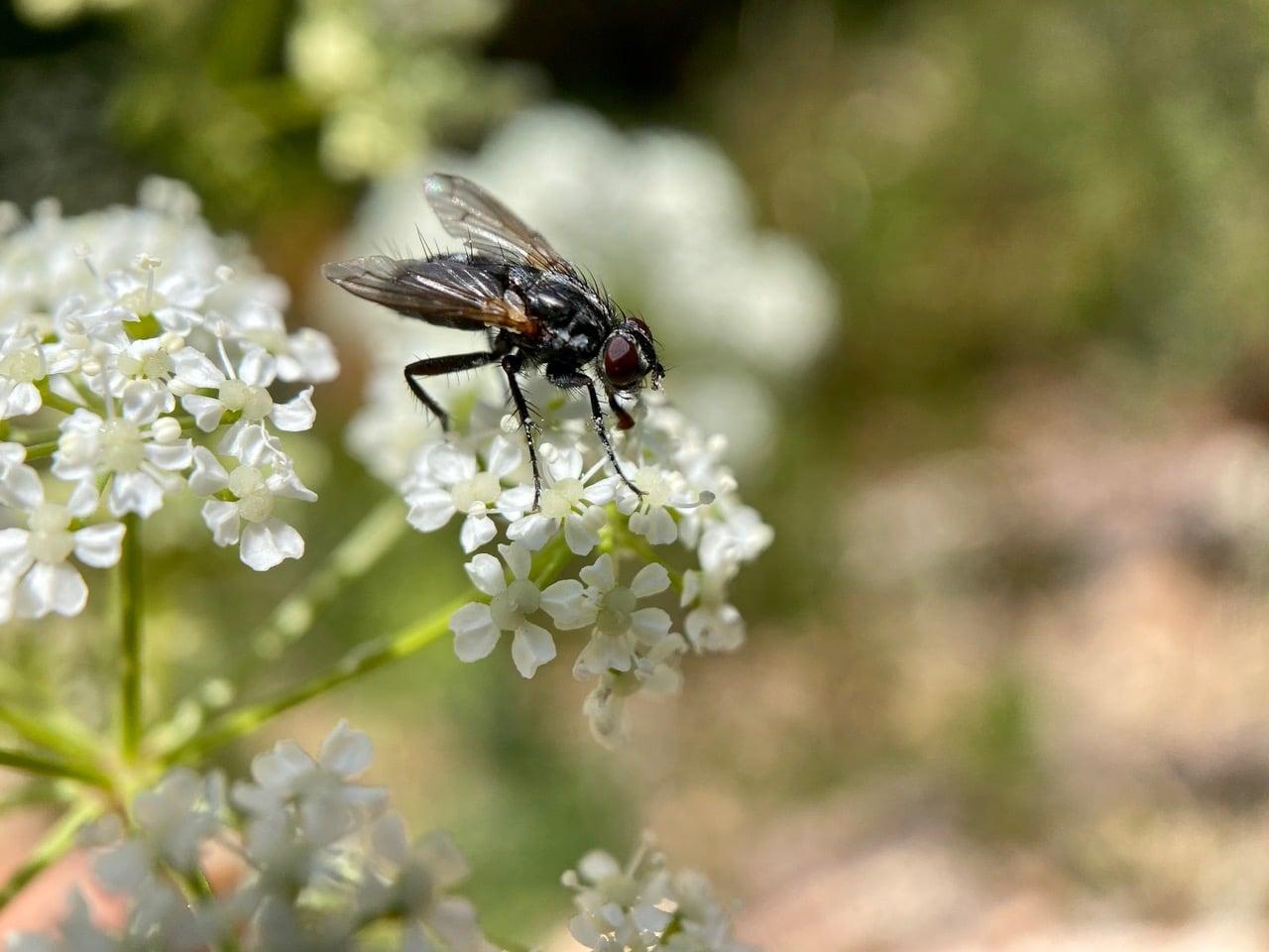 Very common on the Poison Hemlock flowers are these small, black, bristly flies. They are Woodlouse Flies, Stevenia deceptoria (family Rhinophoridae).