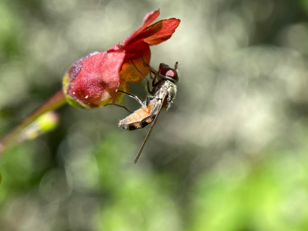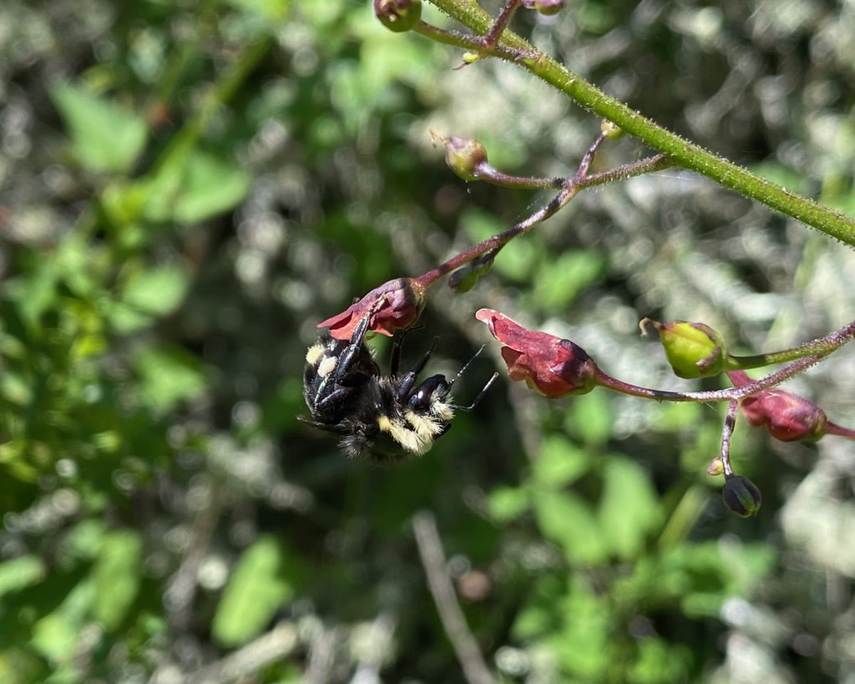A Yellow-faced Bumble Bee just finished sipping nectar from a flower of the California Bee Plant, Scrophularia californica, and is reaching for an adjacent flower.