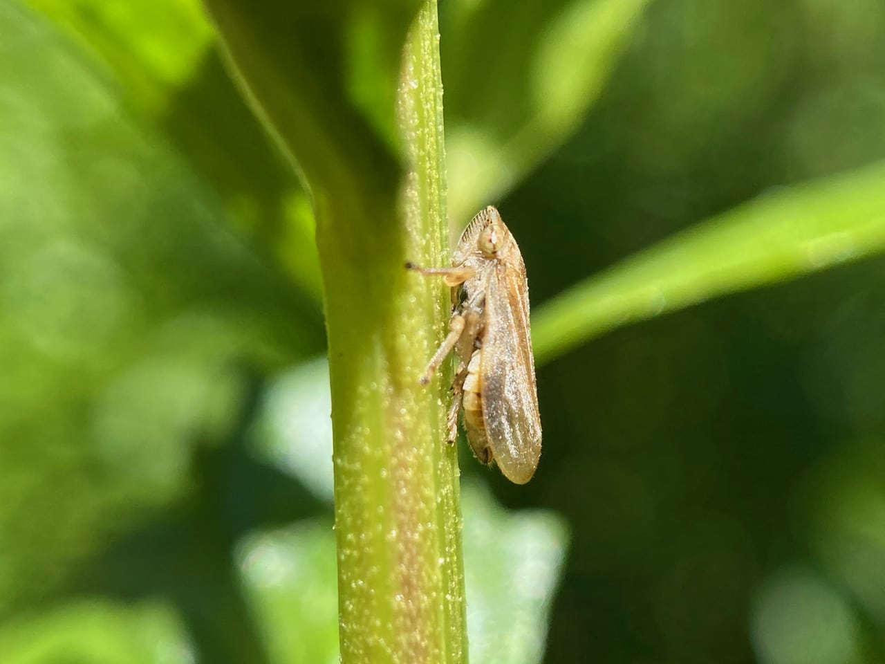 A Froghopper or adult Spittlebug, Philaenus sp. (family Aphrophoridae) is perched stock still on a Baccharis stem.