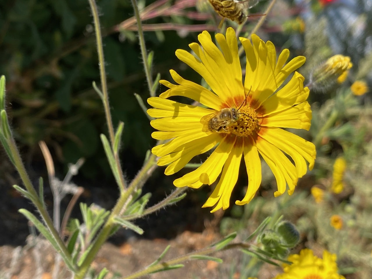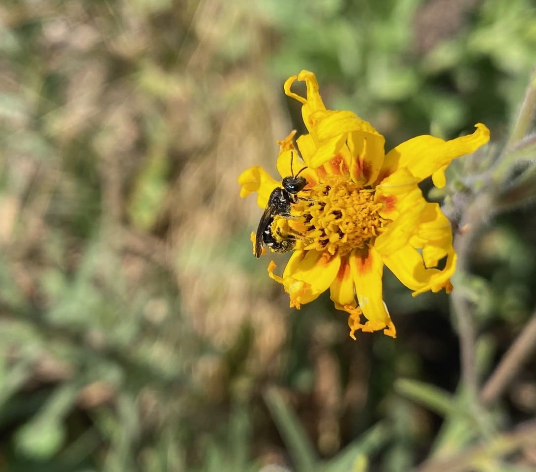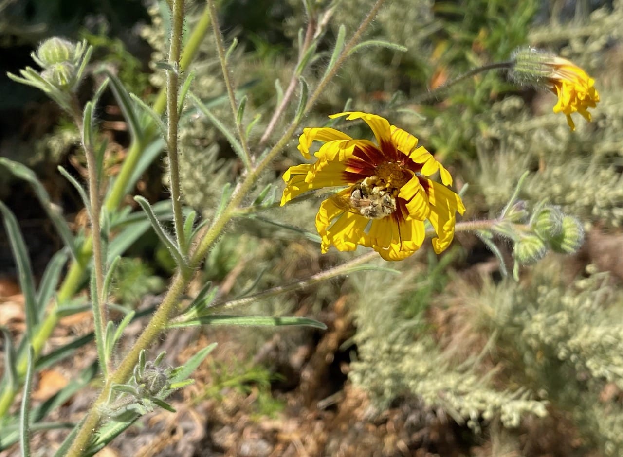 … when out to the blue, another male Melissodes dive-bombs him. The action was quick and intentional, but both males fly away seemingly unharmed. These shenanigans are a common sight around the tarweeds.