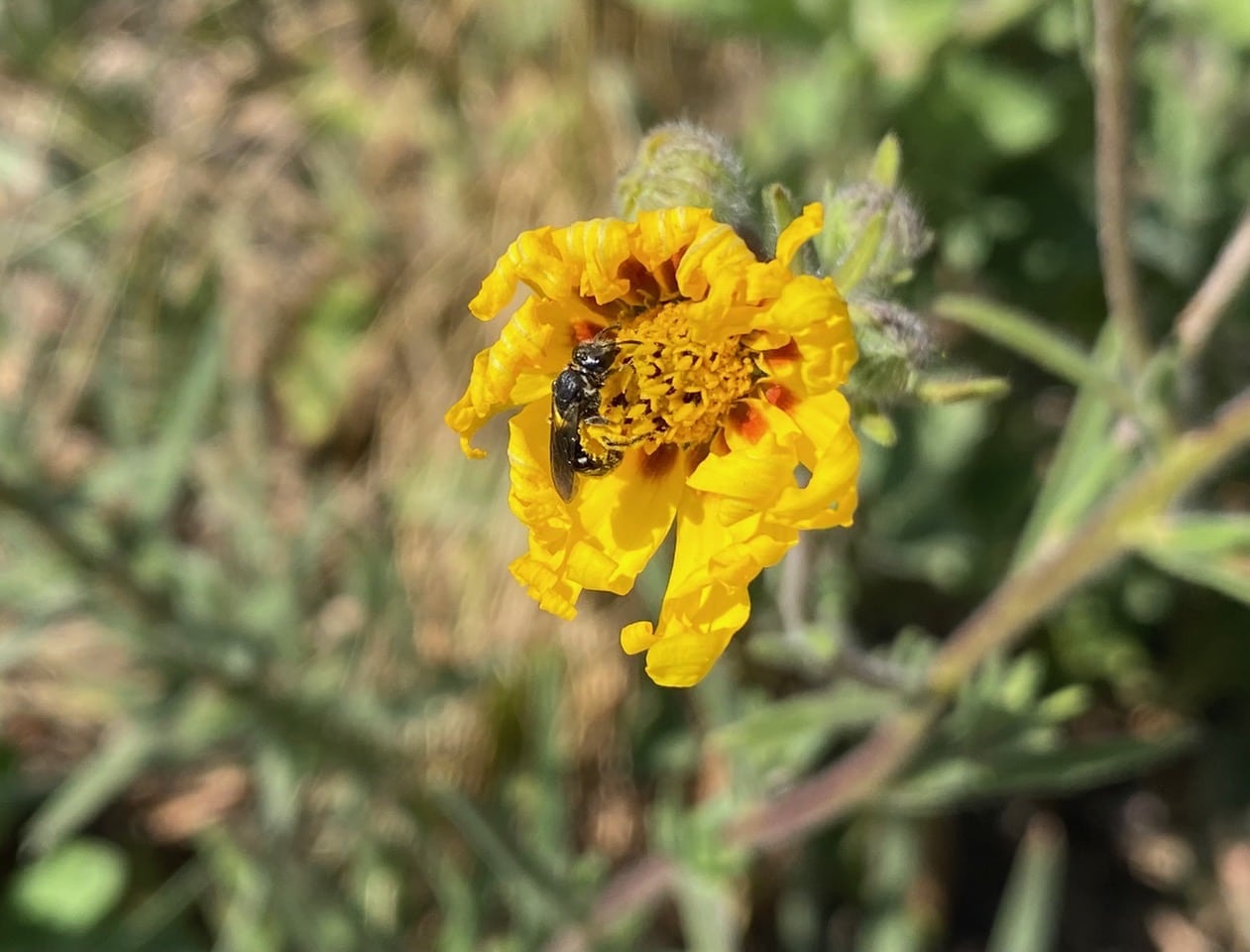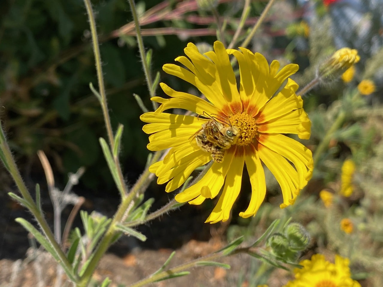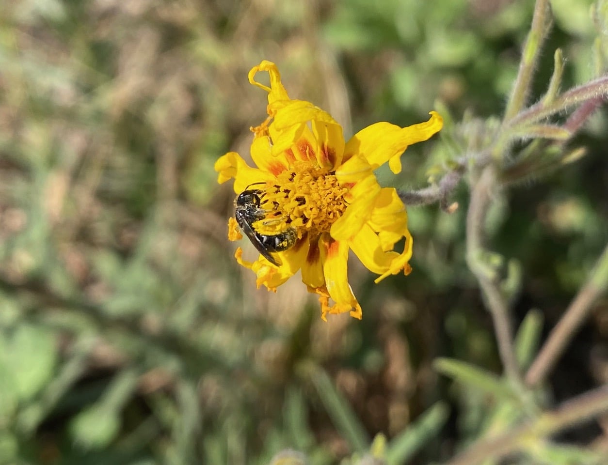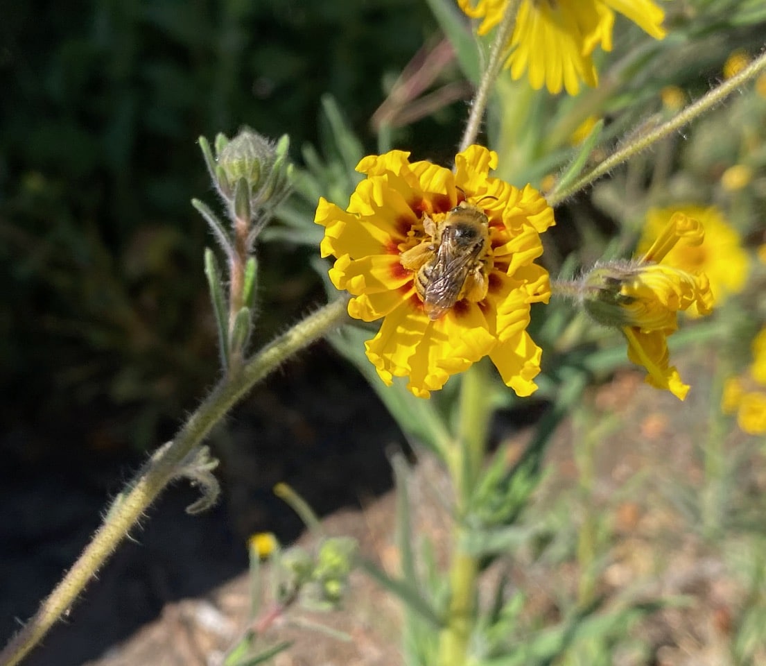 Away from the tarweed frenzy, this male Melissodes is taking his time enjoying a sip of nectar. Male bees do not collect pollen, so they can be seen visiting all sorts of flowers as long as there is accessible nectar.