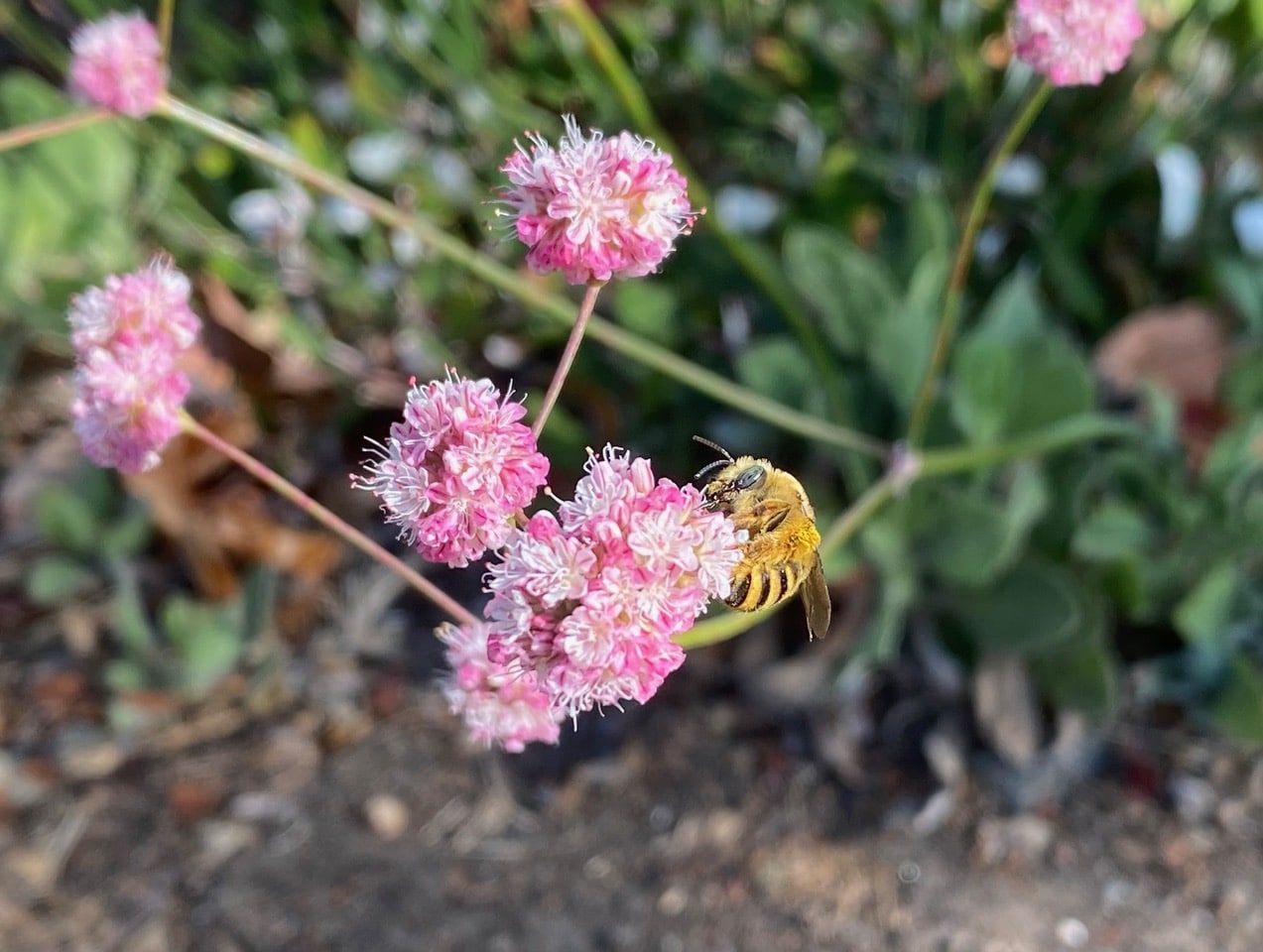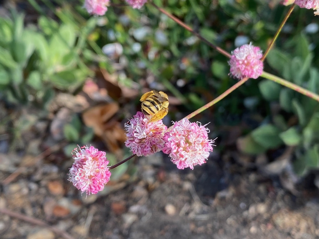 I arrive at Naomi’s native plantings on the Lincoln Ave. sidewalk strip in Alameda a little before 9 am, thinking that I would find some male Summer Longhorn Bees still sleeping. No such luck!