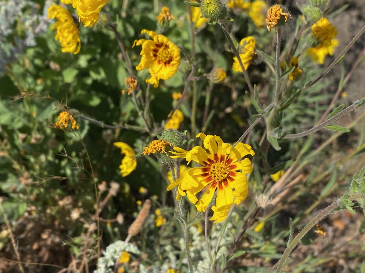 The sun is shining brightly in the sky, and most of the flowerheads of Elegant Tarweed, Madia elegans are already closing, with their ray petals curling in!
