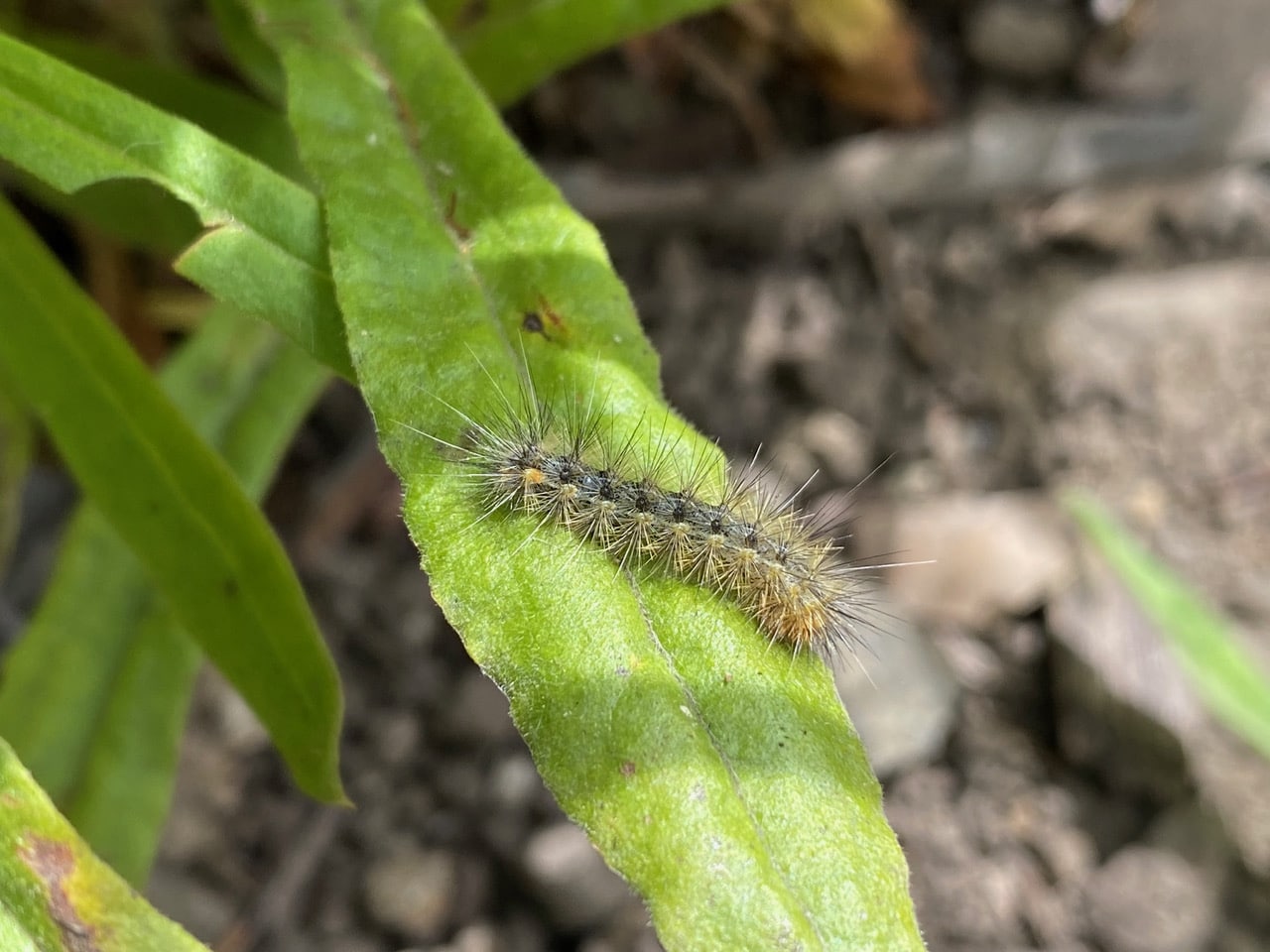 A tiny caterpillar with long bristles is resting on a lower leaf of California Everlasting. It is a member of the family Eribidae. There are no signs of fresh feeding damage on the plant.