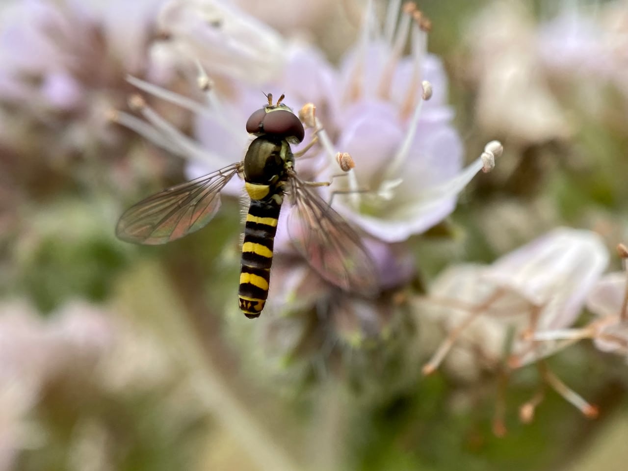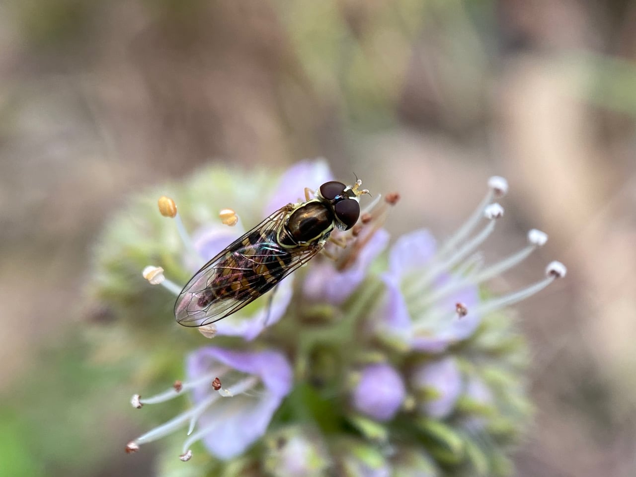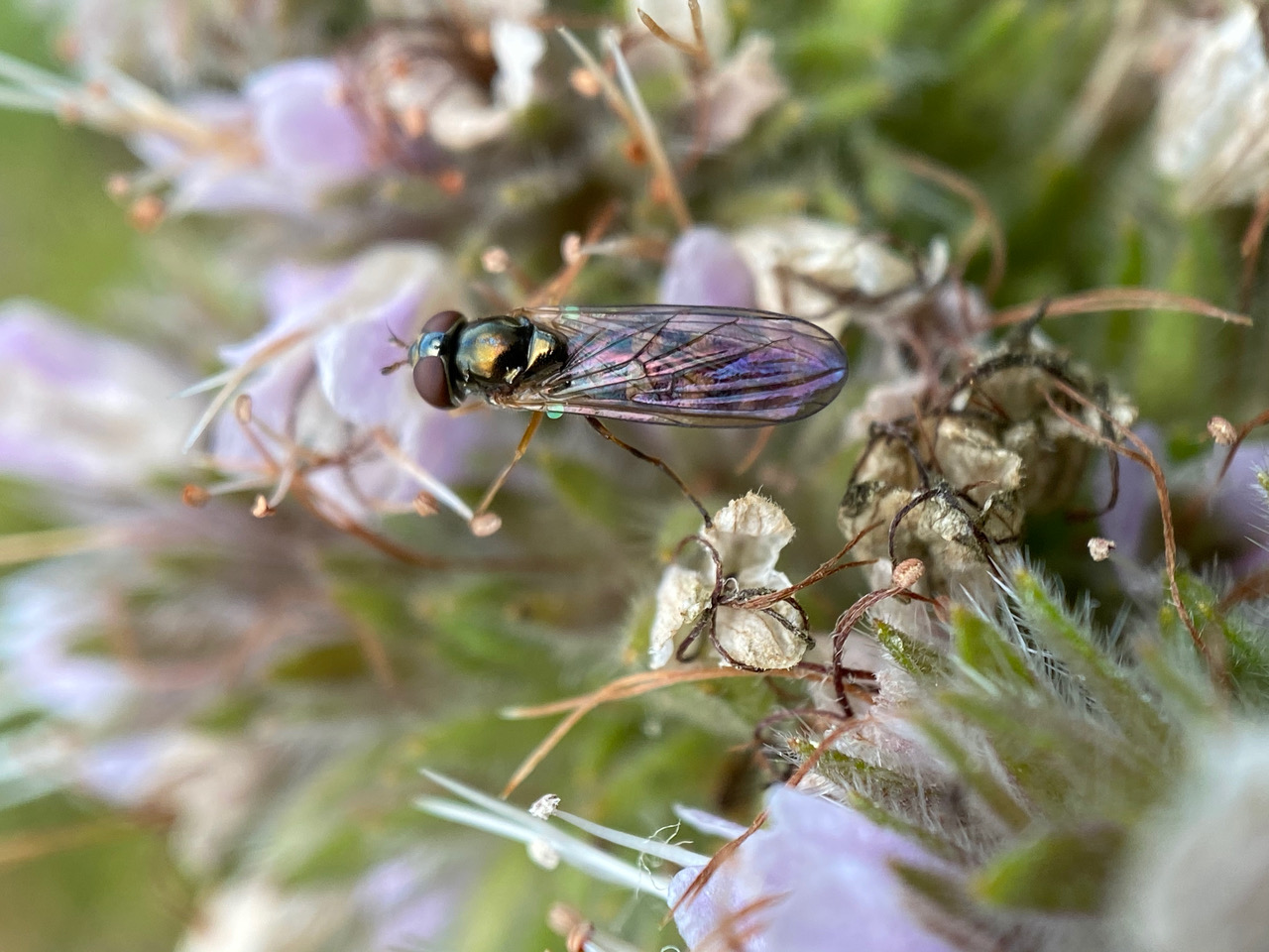 A male Diamond Spottail Hover Fly, Fazia micrura (family Syrphidae) is feeding on the pollen of California Phacelia.