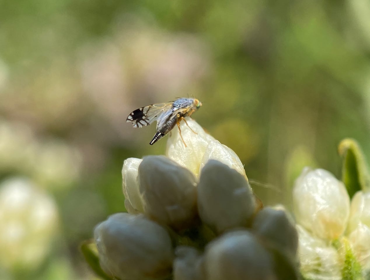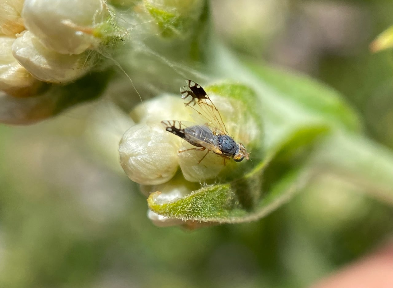 It’s that tiny Fruit Fly, Trupanea sp. (family Tephritidae) again, and again a female roaming the immature inflorescence of California Everlasting, Pseudognaphalium californicum! I have come across this scene too many times to think that it is just coincidental. There’s probably a specific relationship between the fly and the plant. She is probably here to lay her eggs!