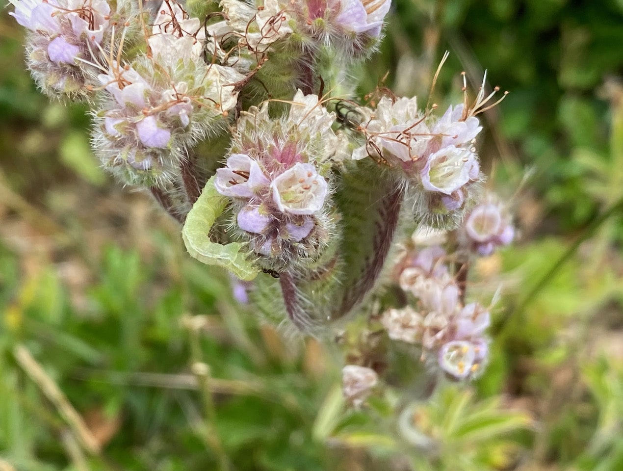 Another Inchworm caterpillar on California Phacelia inflorescence. Note the three pairs of true legs behind the head, followed by a long expanse of body segments with no prolegs.