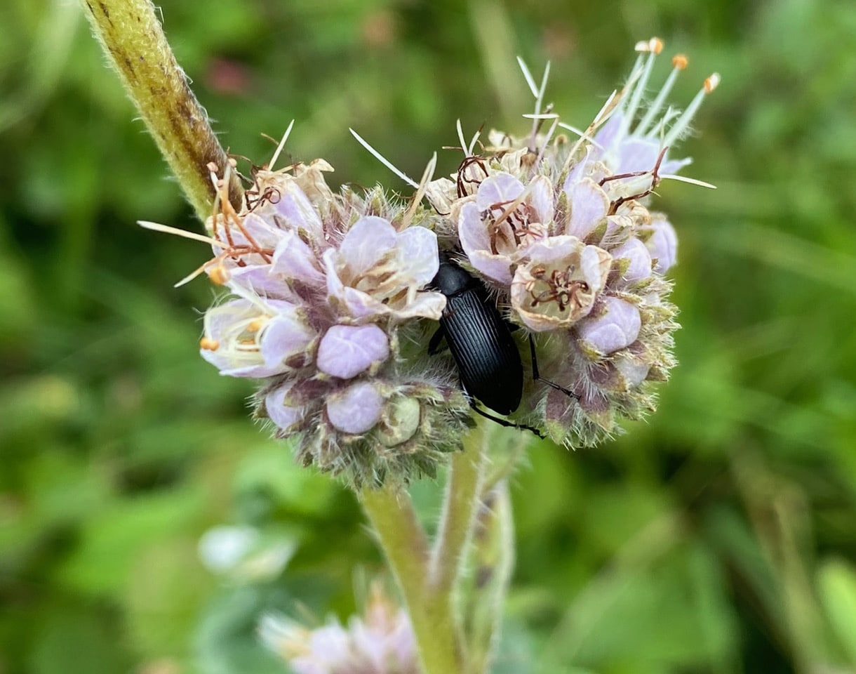A black beetle is resting motionless between the flowers of California Phacelia, Phacelia californica. Not wanting to disturb the beetle, I tag the plant with a piece of red yarn. I’ll check on the beetle on the way back.
