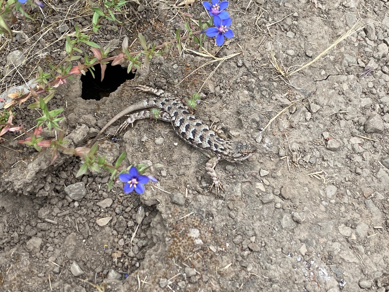 Just a few yards further, a furtive and much darker lizard is hanging out around some holes in the bare ground. Are those holes the nest entrances of ground nesting bees? Do lizards hunt bees? In early spring this year I saw a young lizard make an unsuccessful leap for a Digger Bee, Anthophora sp. that disappeared into its borrow in the nick of time.