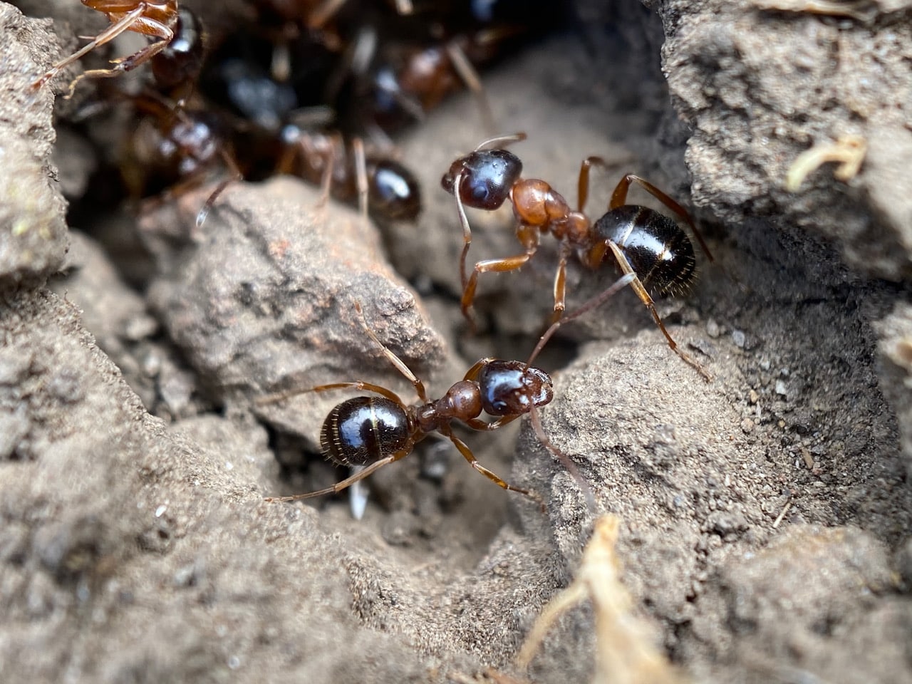 Formica ants do not have a stinger. But they can bite, and squirt formic acid from their rear ends into the wound. Ouch!
