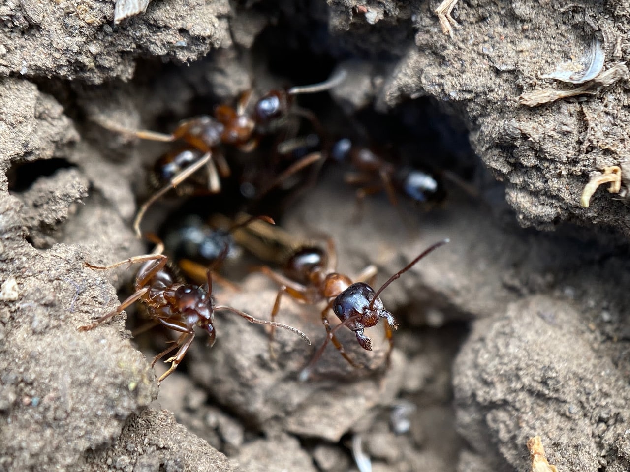 I come across the same nest entrance of the Field Ants, Formica subpolita (family Formicidae) in the middle of the trail. The ants are active and approach my camera with open jaws. I have to be careful not to get bitten while photographing them at such close range (one inch).