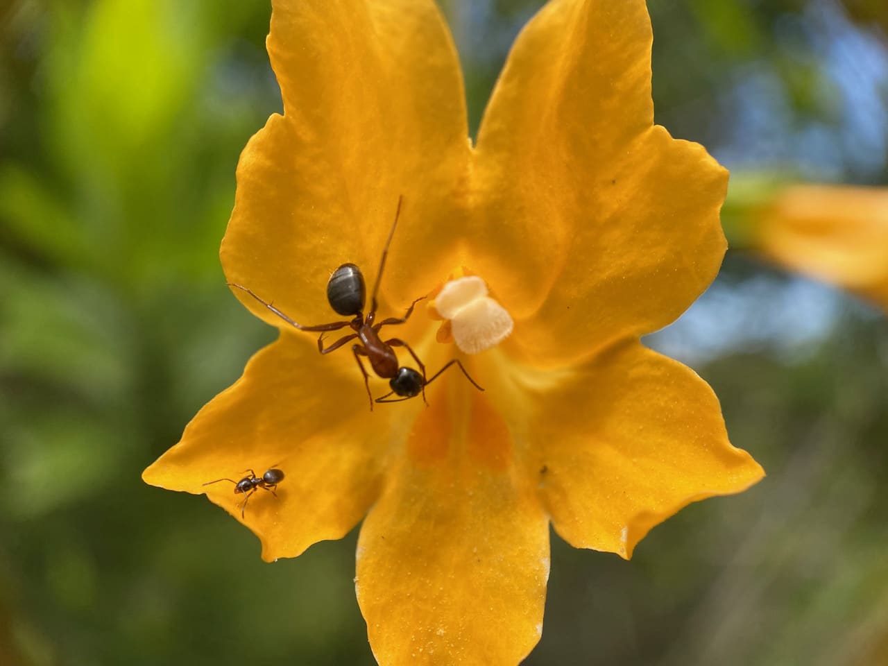 Two ants of vastly different sizes are foraging on the same Sticky Monkeyflower. The large on is probably a Field Ant, Formica sp., while the small one might be an Odorous House Ant, Tapinoma sessile.
