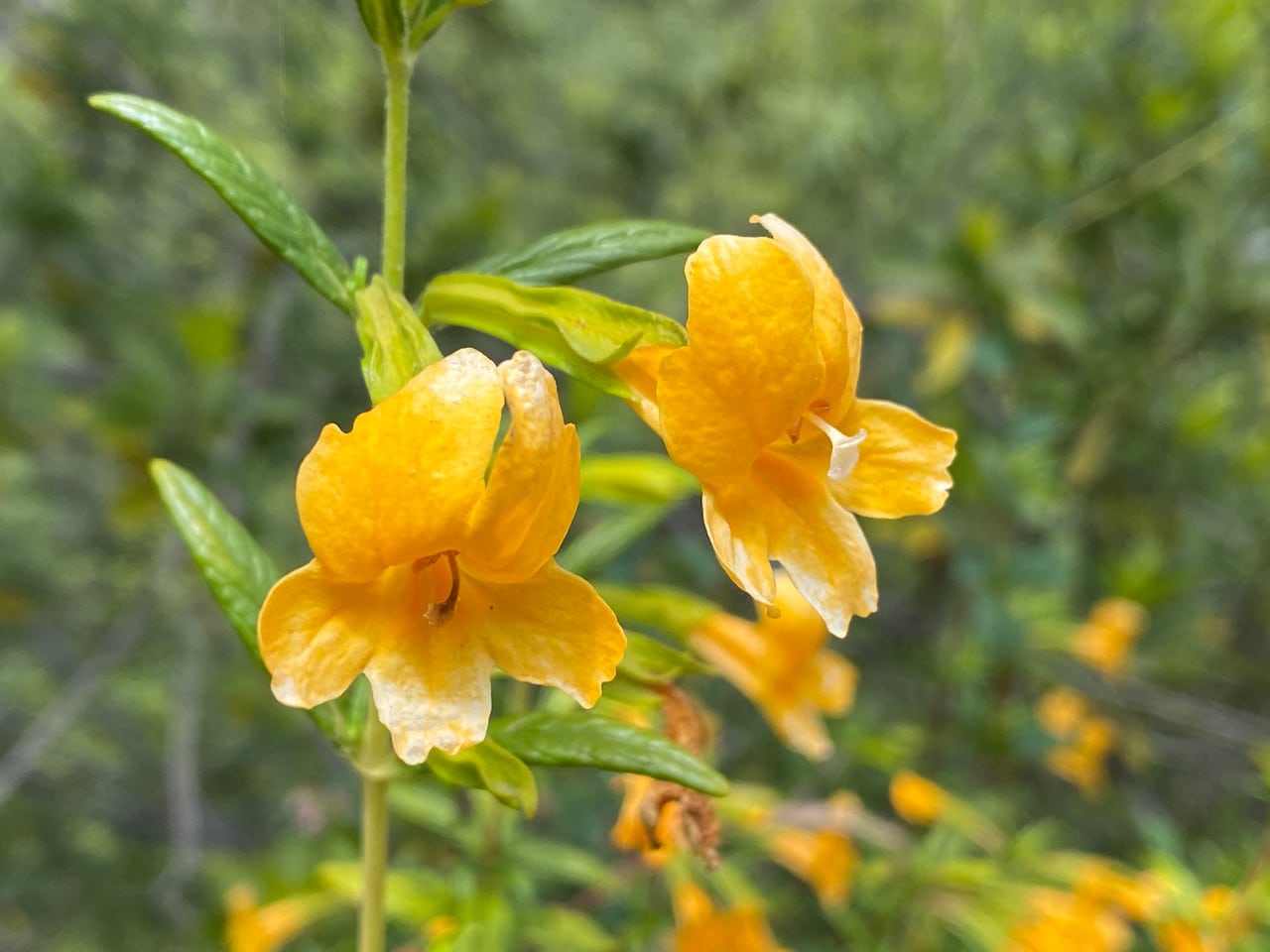 Many of the fresh Sticky Monkeyflowers that are on the top of the branches now have this bleached appearance. The pigments are lost from the edges fo the petals. Wind burn? Flash drought?