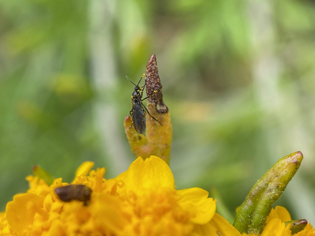Its body covered with sticky pollen, a Dark-winged Fungus Gnat (family Sciaridae) is grooming itself on a leafy bract that subtends the cluster of Golden Yarrow flowerheads.