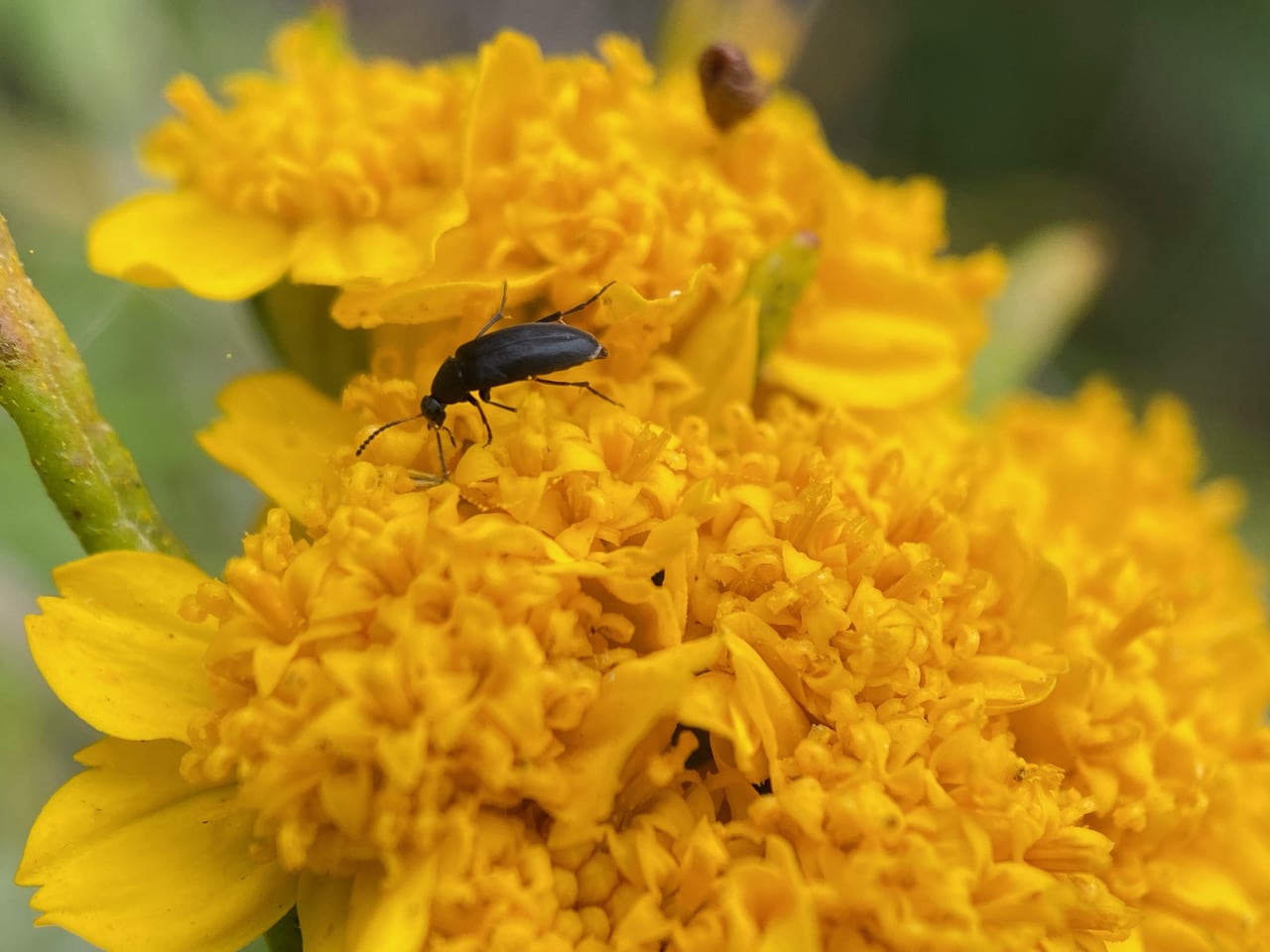 A False Flower Beetle is foraging among the flowers of Golden Yarrow. False Flower Beetles, Anaspis atrata (family Scraptiidae) are commonly found in western North America. The adults are found on flowers, sometimes in large numbers, but are also found on foliage. The larvae are typically found under the bark of dead trees.
