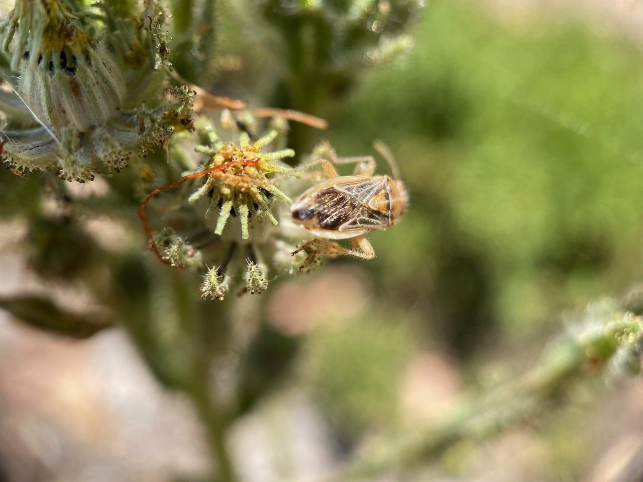 Many of the flowers of this Coast Tarweed, Madia sativa have gone to seed, attracting numerous seed eaters. Do you see the well-camouflaged Scentless Plant Bug, Arhyssus sp. (family Rhopalidae) perched on a developing Coast Tarweed seed head?