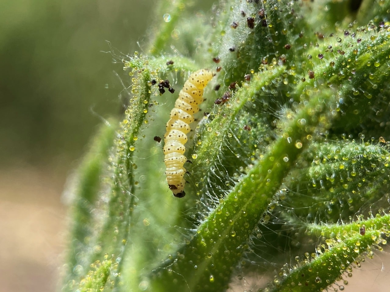 American Lady caterpillars are solitary feeders and construct nests from various parts of their host plant. Tiny larvae use leaf hairs to construct tiny nests; larger caterpillars arrange leaves, flower heads, and detritus to form tight shelters. Several structures are typically built during the caterpillar’s development.
