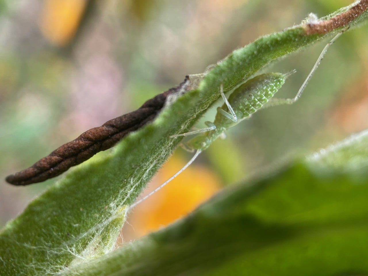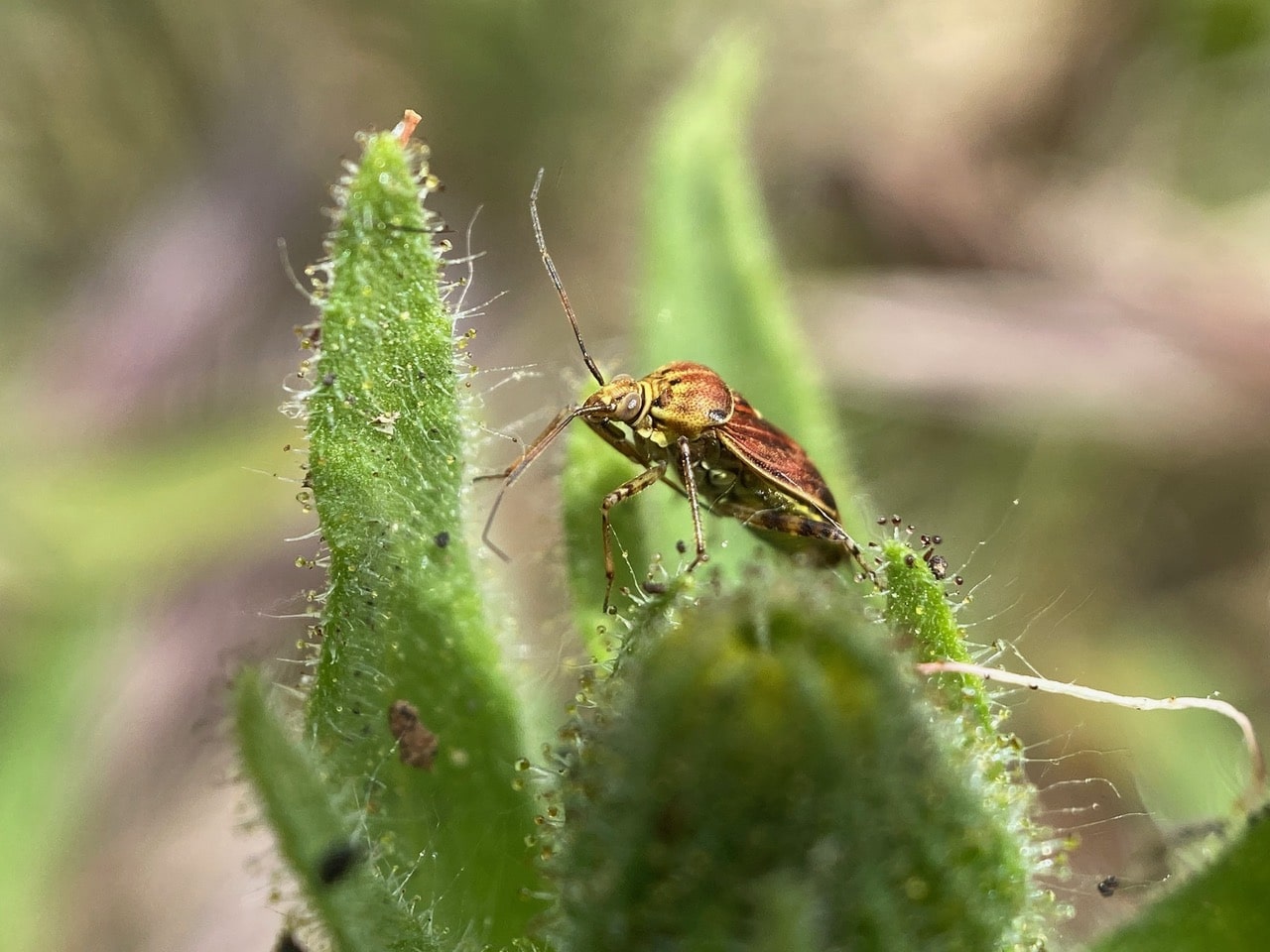 A Lygus Bug, Lygus sp. (family Miridae) is roaming the terminal leaves of a Coast Tarweed, Madia sativa. The term lygus bug is used for any member of the genus Lygus, in the family of plant bugs, Miridae. Adult lygus are approximately 3 mm wide and 6 mm long, colored from pale green to reddish brown or black. They have a distinctive triangle or V-shape on their backs. Lygus bugs are known for their destructive feeding habits – they puncture plant tissues with their piercing mouthparts, and feed by sucking sap. Both the physical injury and the plant’s own reaction to the bug’s saliva cause damage to the plant. Many lygus bugs are well-known agricultural pests.
