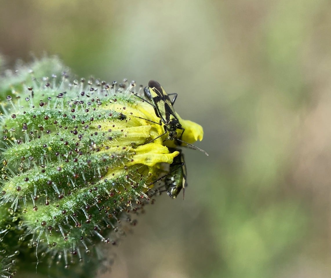 Immune to the sticky exudates of the glandular hairs on the phyllaries, two tiny Plant Bugs, Macrotylus essigi (family Miridae) are feeding on an immature flowerhead of Coast Tarweed, Madia sativa.