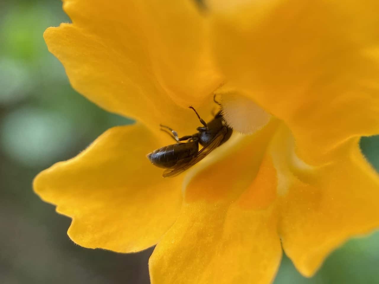Pollen grains have adhered to the Masked Bee as she exits the flower. Although the nectar and pollen she collects are stowed in her crop, the bee can still be an effective pollinator, transferring pollen between flowers.