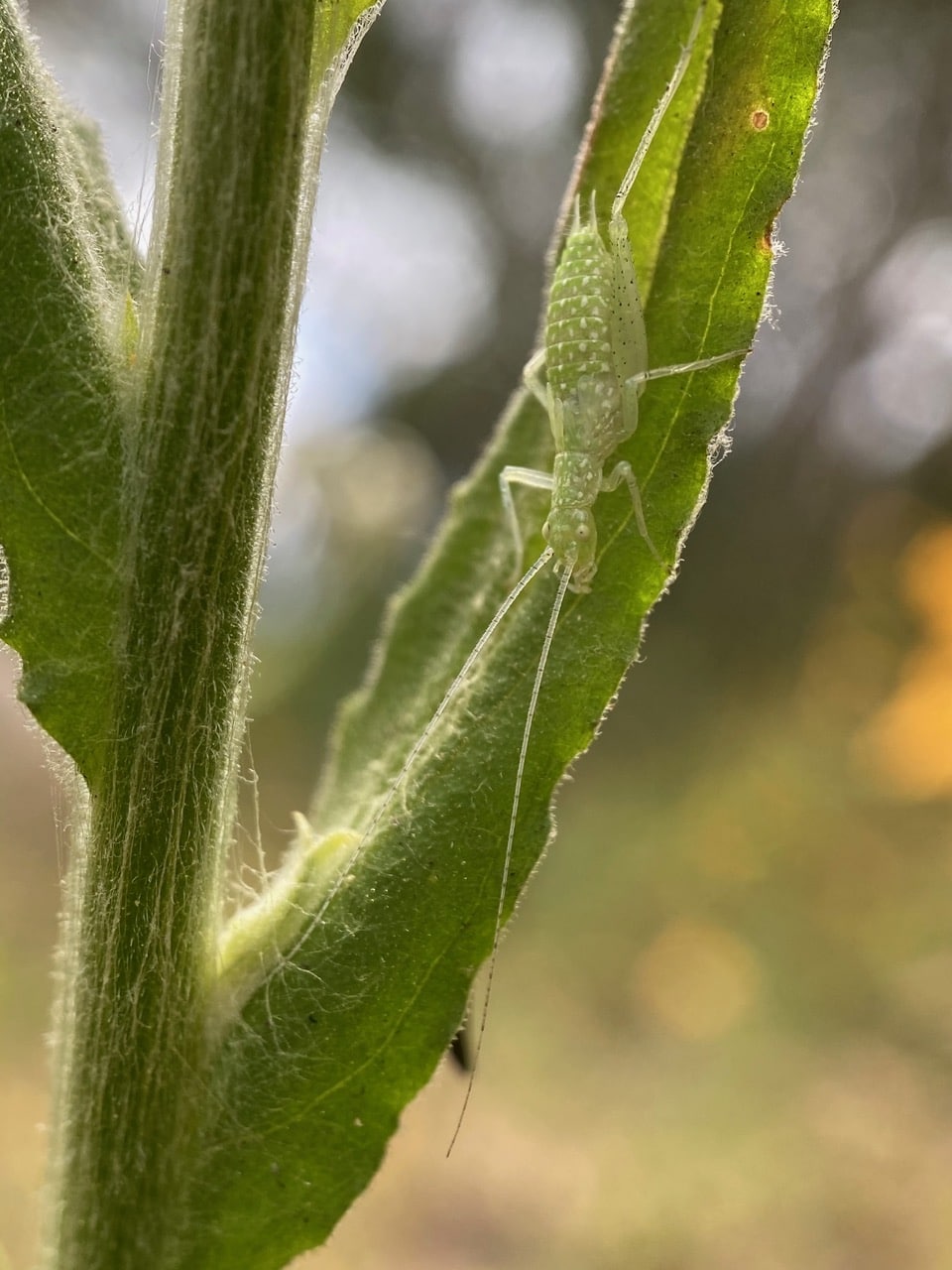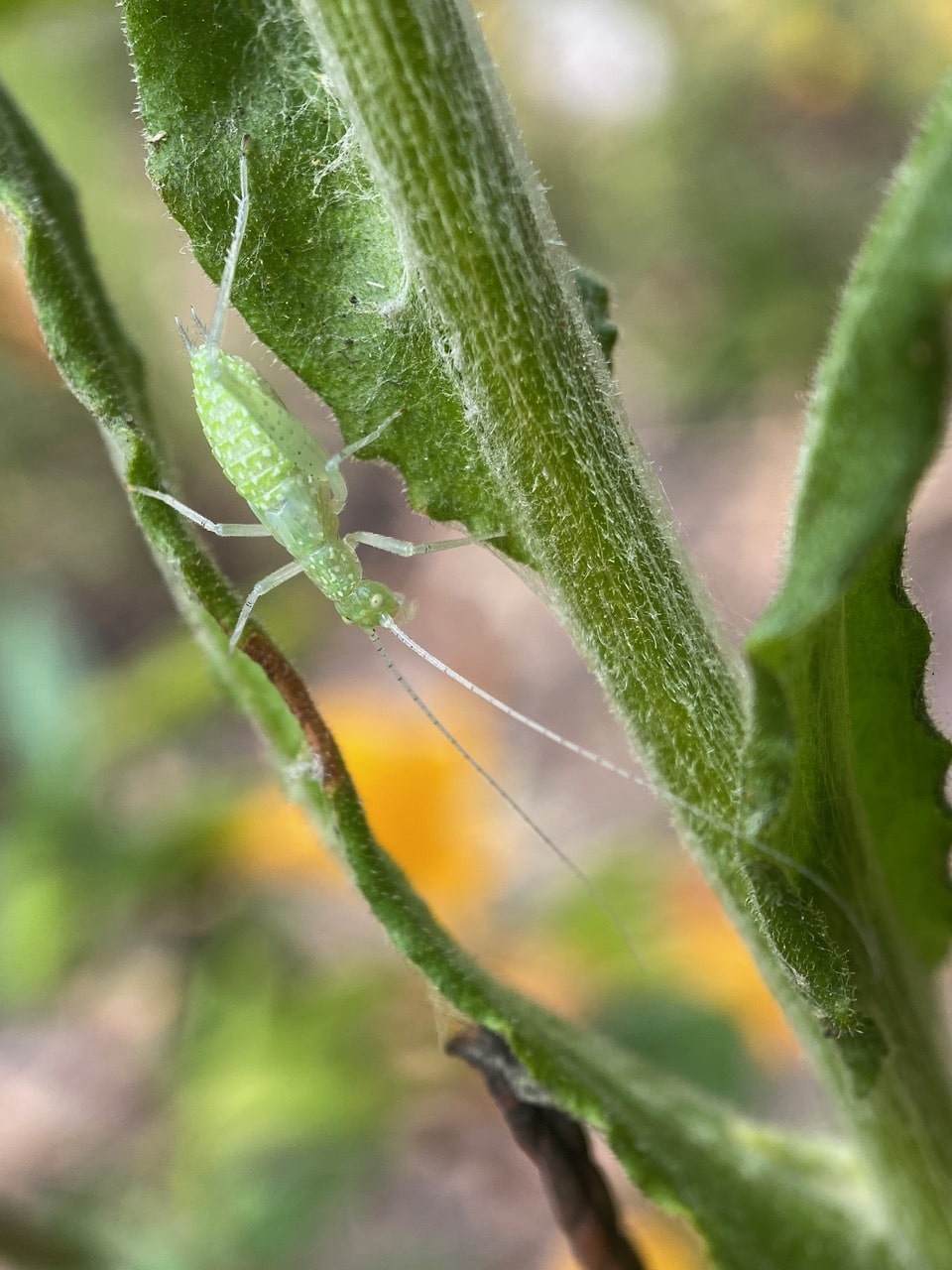 Movements in the foliage of the California Everlasting alert me to the presence of a very young nymph of the Common Tree Cricket, Oecanthus sp. (family Gryllidae). It is a translucent pale green and only about 1/4 in. long, excluding its long antennae. Note the small wing buds behind its thorax.