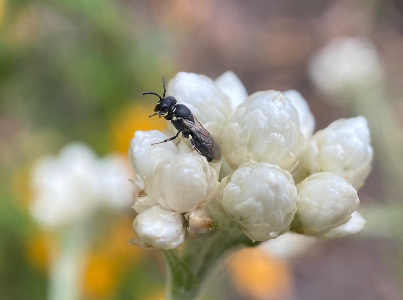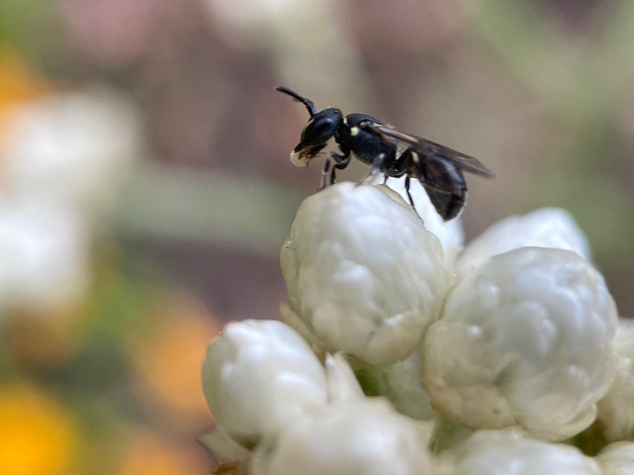 A female Masked Bee, Hylaeus sp. (family Colletidae) is perched on a cluster of flowerheads of California Everlasting. I can tell she’s female from the small yellow marks on her face. Note the absence of scopa (special pollen collecting hairs) on her body.